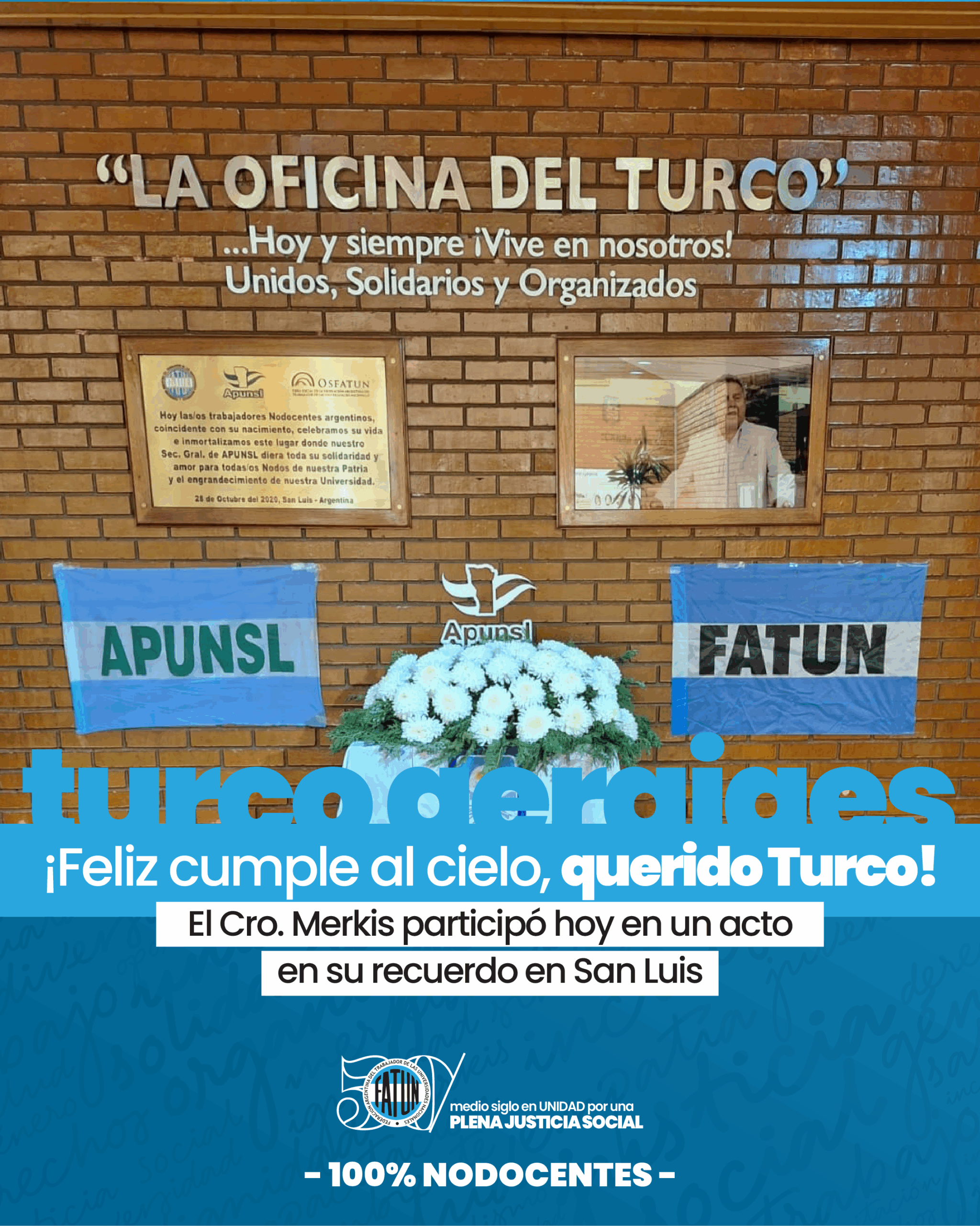 En conmemoración de su natalicio, nuestro Secretario General, Cro. Walter Merkis, estuvo presente en el día de hoy en el acto que la Asociación del Personal de la Universidad de San Luis (APUNSL) llevó a cabo en “La oficina del Turco”, en la Universidad, con el propósito de recordarlo y rendirle un merecido homenaje. En el mismo, se destacaron sus logros, su compromiso y su destacada labor para con el colectivo y la UNSL, sin dudas un momento especial para recordarlo y valorar su legado.