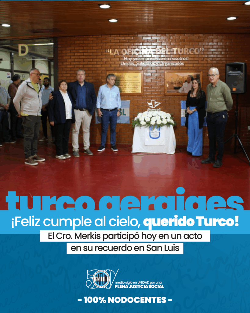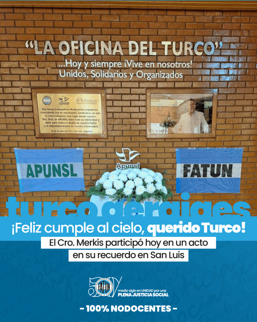 El “Turco” dedicó su vida a luchar por los derechos de las y los trabajadoras/es NODOCENTES en la Universidad de San Luis y más allá. Su pasión y dedicación inspiraron a todos los que tuvimos el honor de conocerlo y trabajar a su lado.