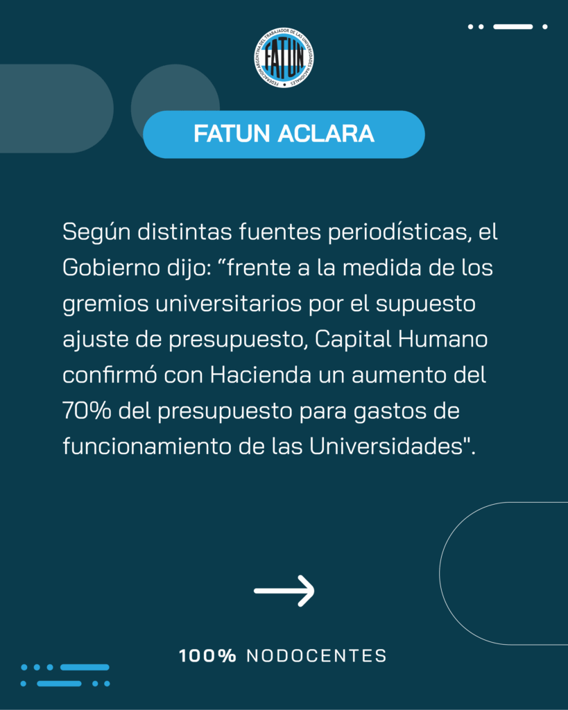 Ante el transcendido que el Gobierno realizó a la prensa sobre un POSIBLE aumento del 70% al Presupuesto Universitario, FATUN ACLARA ESTA INFORMACIÓN Y SEÑALA: