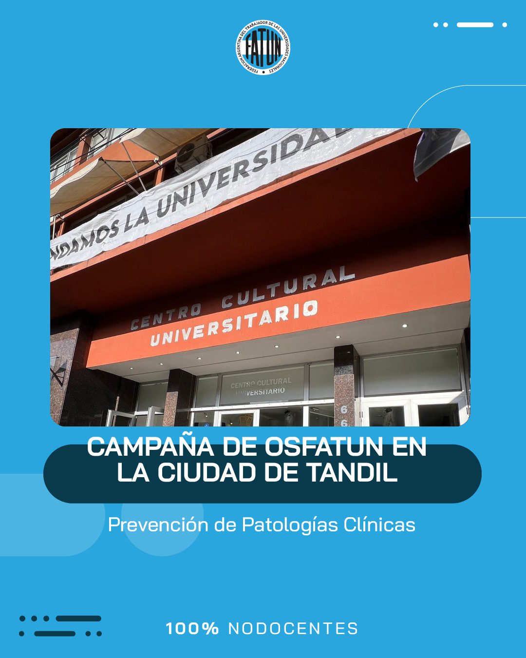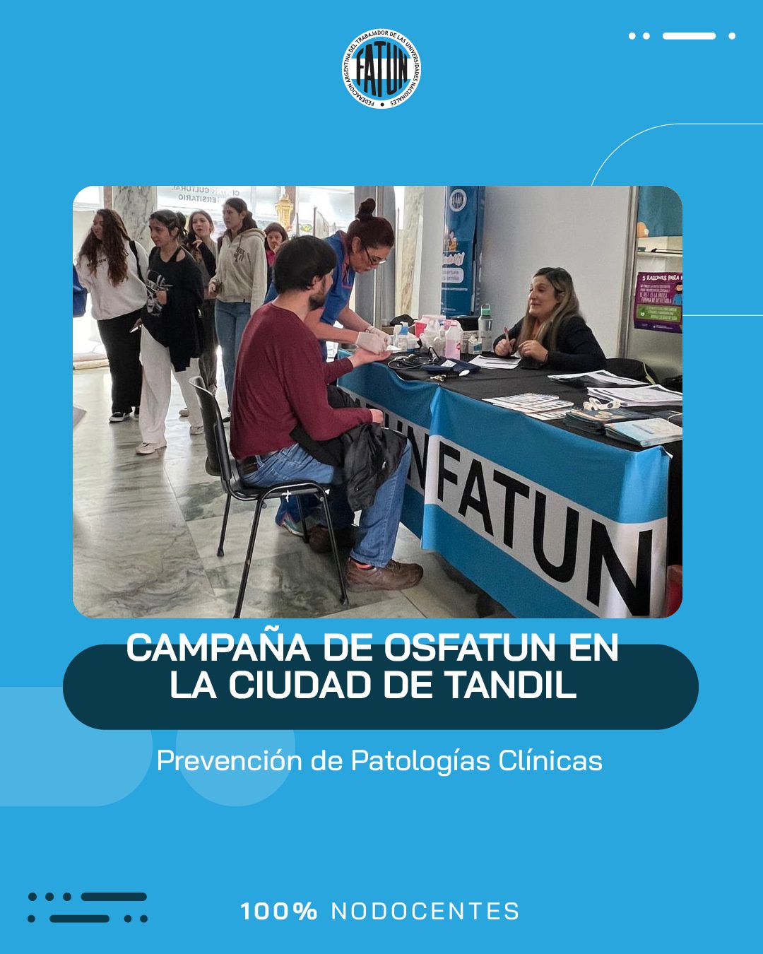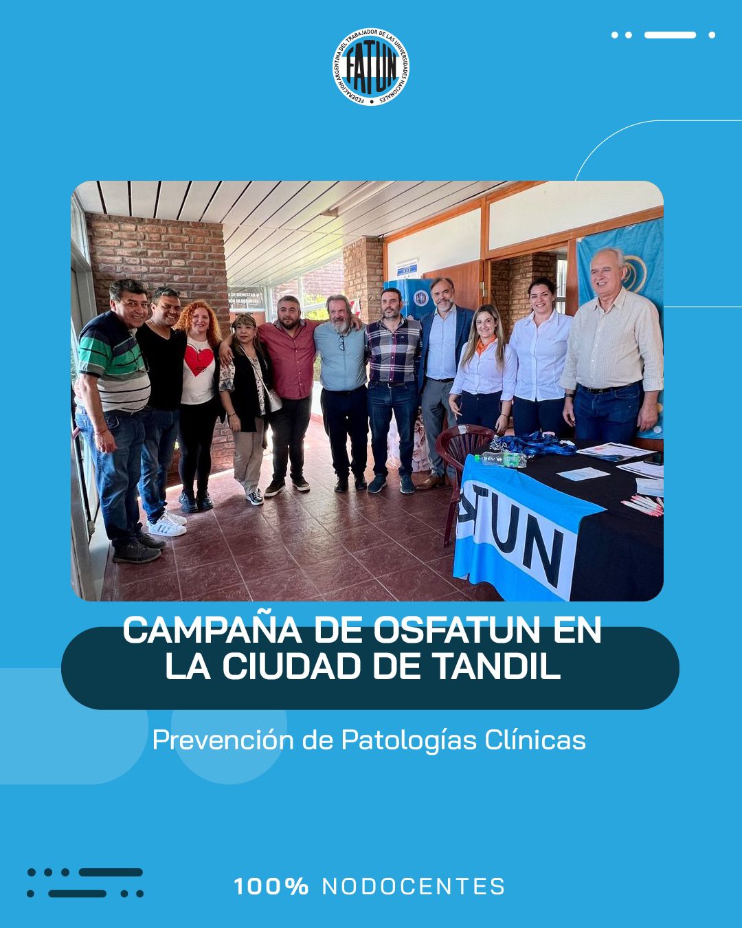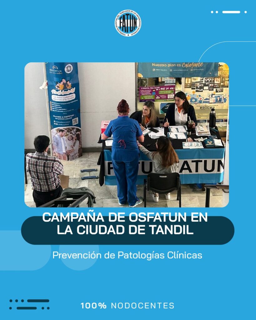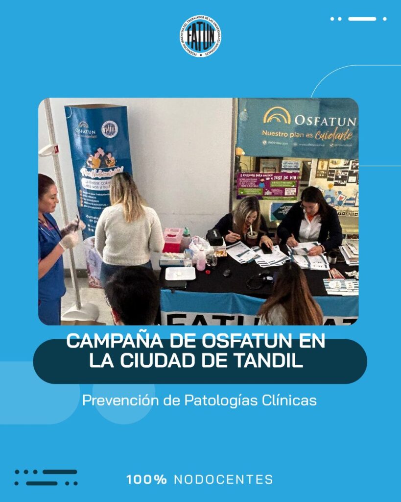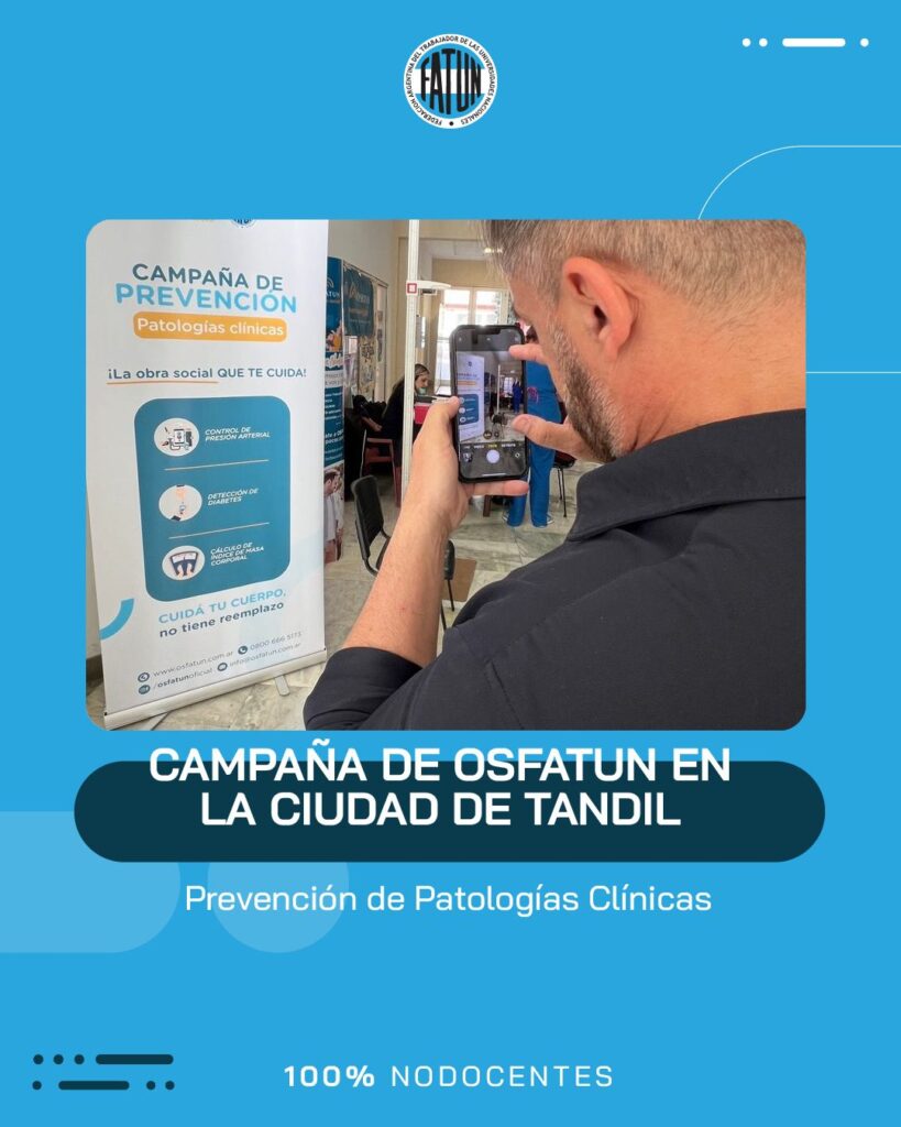 Luego de participar de la inauguración del nuevo edificio de la Delegación Tandil de la OSFATUN, el Secretario General de FATUN, Cro. Walter Merkis, quien junto al Secretario General de la ATUNCPBA, Cro. Juan Loidi, se acercaron hasta el Centro Cultural Universitario de la UNICEN, para participar de la Campaña de Prevención de Patologías Clínicas que se llevó a cabo en dicha ciudad.
