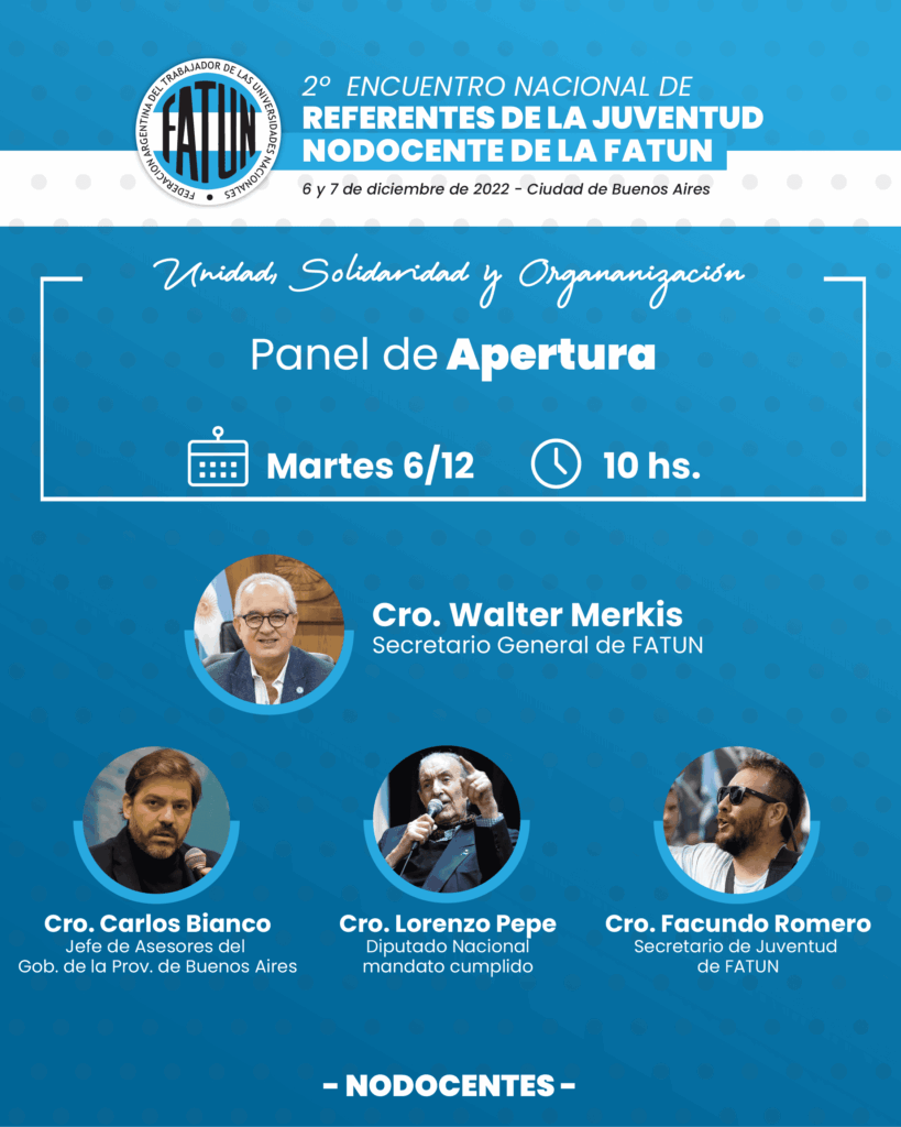 En el marco del 2º Encuentro Nacional de Jóvenes Referentes NODOCENTES de la FATUN, compartimos información sobre los paneles que se desarrollarán, sus expositores y moderadores. Invitamos a ingresar a https://encuentrojuventud.fatun.org.ar para conocer más sobre el evento. #juventudnodocente #juventudperonista #juventudfatun#fatun #nodocentes #merkisconduccion