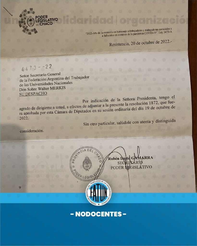 En nombre de la Mesa Ejecutiva Nacional y, en especial, de nuestro Secretario General, Cro. Walter Merkis, agradecemos y saludamos a la Honorable Cámara de Diputados de la Provincia del Chaco, particularmente a la Cra. Lidia Élida Cuesta y al Cro. Rubén Darío Gamarra, Presidenta y Secretario del Poder Legislativo chaqueño, por la Resolución Nº […]