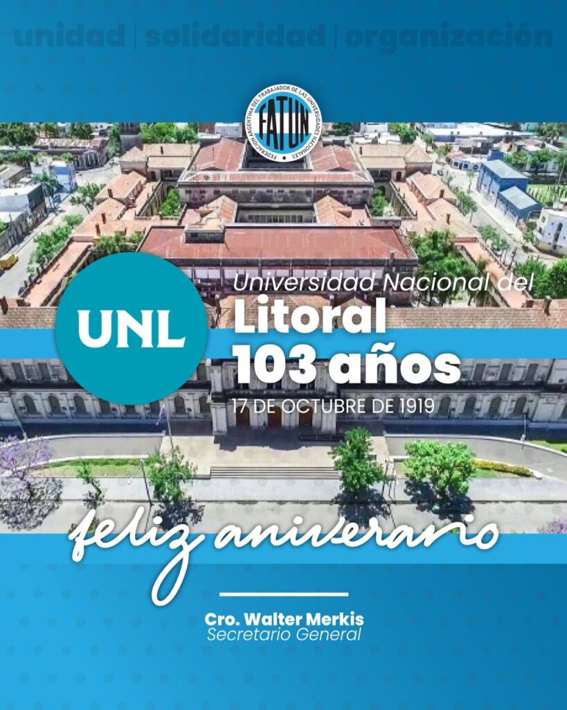 El Secretario General de la Federación Argentina del Trabajador de las Universidades Nacionales, Cro. Walter Merkis, al cumplirse en el día de la fecha el 103º Aniversario de la Universidad Nacional del Litoral, quiere hacer llegar un afectuoso saludo y felicitar esta Casa de Altos Estudios y a toda su comunidad universitaria. Desde la FATUN […]
