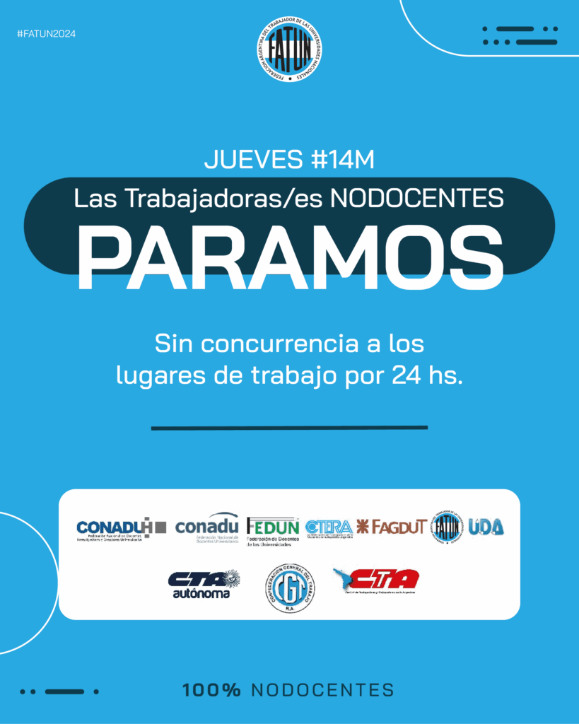 Las/os NODOCENTES PARAMOS: • por un presupuesto que garantice el funcionamiento de las universidades. • por negociaciones paritarias abiertas para acordar nuestros salarios. • en defensa de las universidades ante los ataques del Gobierno. • por el derecho estudiantil a la Universidad Pública, Gratuita y de Calidad. #14M Paro Nacional Universitario. 24 horas sin concurrencia […]