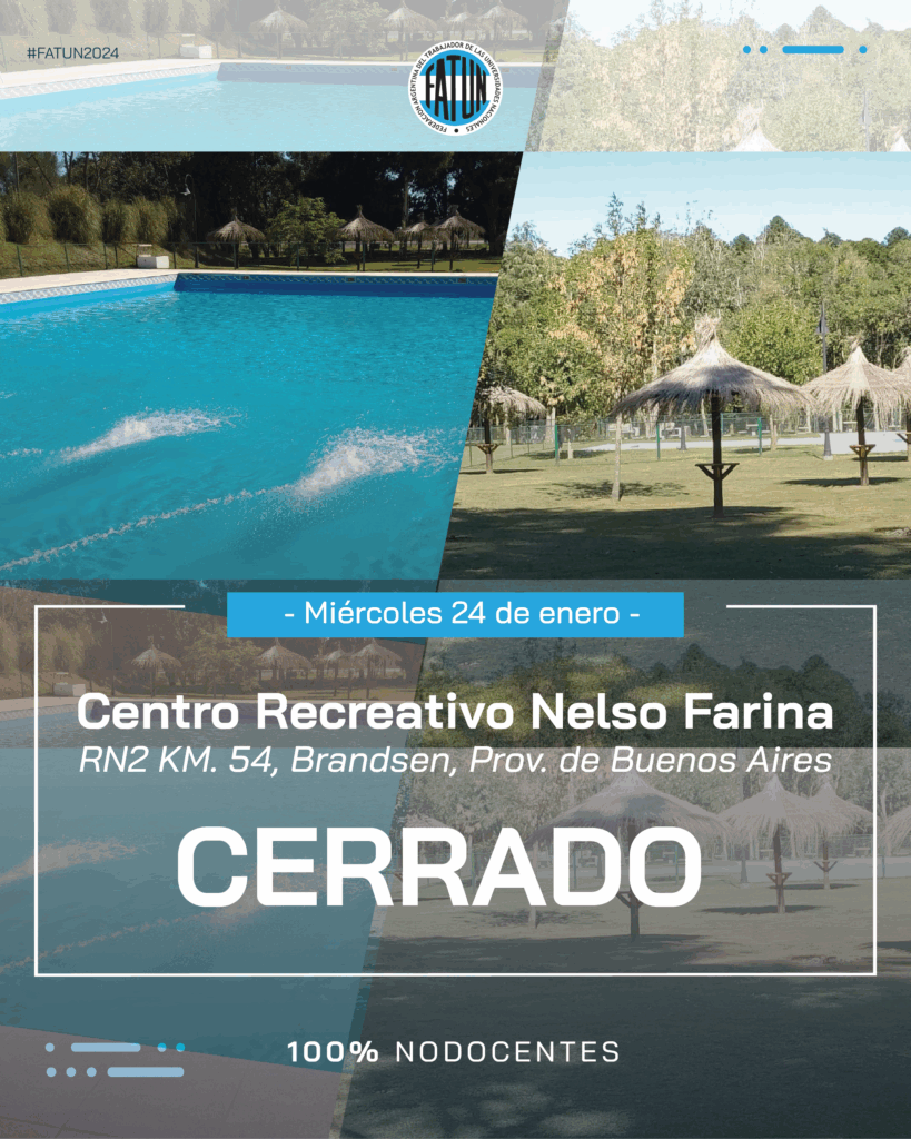 El próximo Miércoles 24 de enero, el Centro Recreativo “Nelso Oscar Farina”, ubicado en el KM 54 de la Ruta Nacional Nro. 2, en la localidad de Brandsen, permanecerá cerrado por el paro general convocado por la CGT, contra el DNU y la Ley Omnibus dictadas por el Poder Ejecutivo Nacional que el nuevo gobierno […]