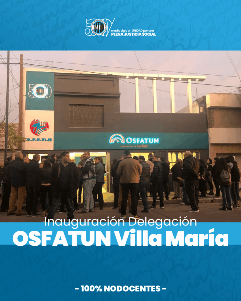 Hoy 29 de junio, nuestro Secretario General y Presidente de la OSFATUN, Cro. Walter Merkis, realizó la inauguración de la nueva Delegación de OSFATUN y sede de la Asociación del Personal de la Universidad Nacional de Villa María (APUViM), en la ciudad de Villa María, con el propósito de otorgar a las/los trabajadoras/es NODOCENTES, comunidad […]