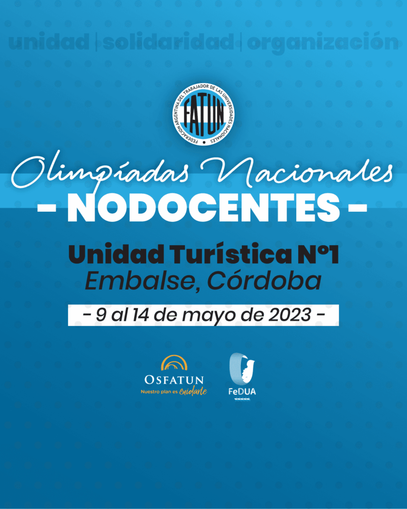 Informamos las fechas CONFIRMADAS en las que se desarrollarán las Olimpíadas Nacionales NODOCENTES: del 9 al 14 de mayo de 2023. La cita se llevará a cabo en la Emblemática Unidad Turística Nº1 de la localidad de Embalse, Provincia de Córdoba, y reunirá a trabajadoras y trabajadores NODOCENTES de 44 Sindicatos de base adheridos, clasificadas/os […]