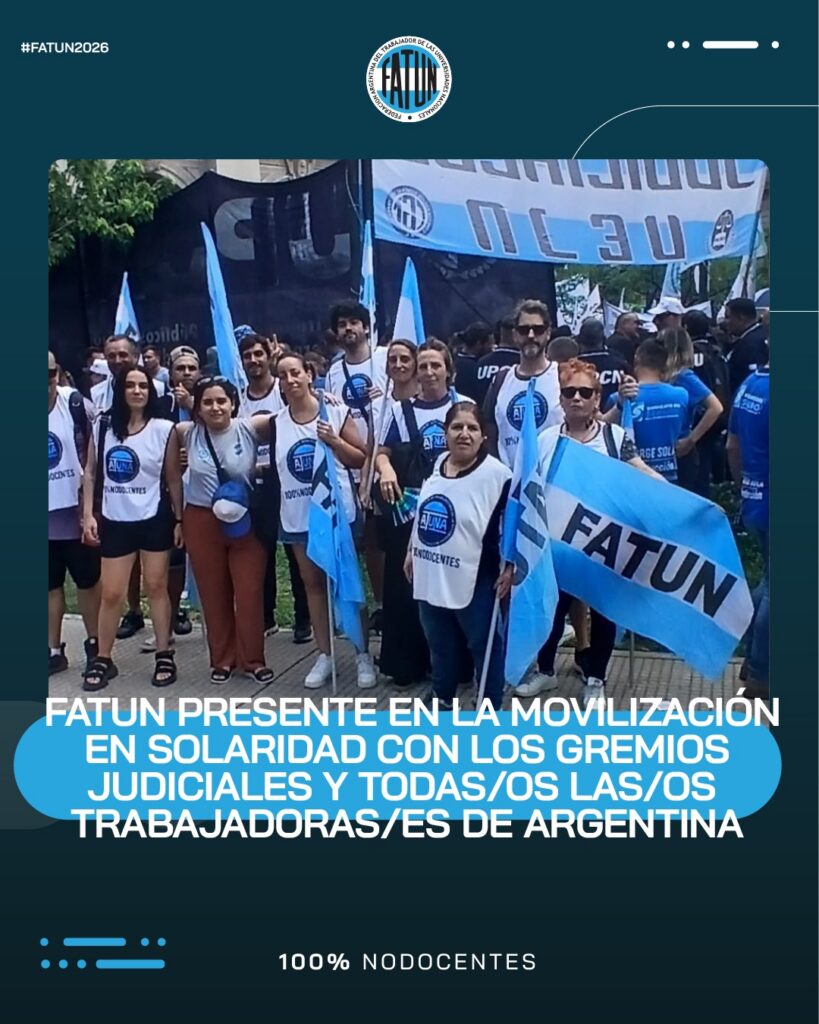 En el día de ayer, compañeras y compañeras de la FATUN participaron de la movilización en apoyo a los gremios judiciales de nuestro país, y en defensa de las/os trabajadoras/es argentinos, en rechazo a la decisión del Gobierno Nacional de traspasar, por medio de la reforma laboral, el Fuero Laboral Federal a la órbita de […]