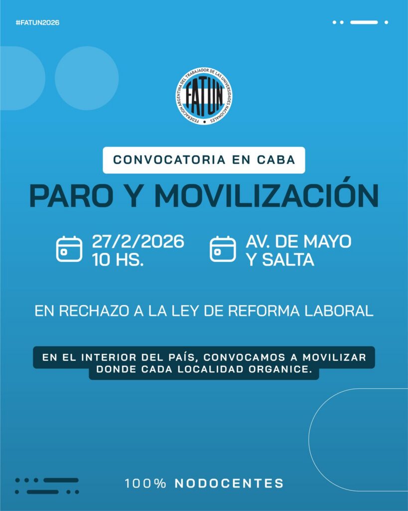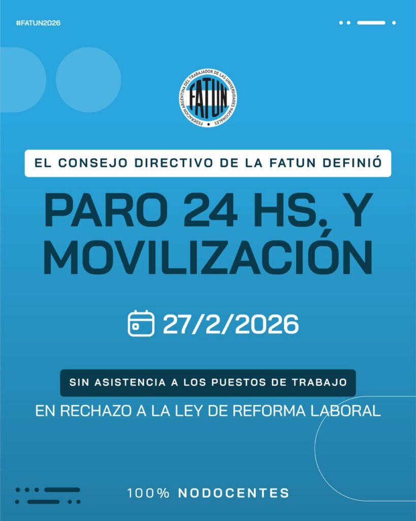En reunión del Consejo Directivo, realizada en el día de la fecha en la FATUN, se resolvió por unanimidad, tras un profundo análisis ante el inminente tratamiento en el Senado del Proyecto de Ley de Reforma Laboral, convocar para el día de mañana, 27 DE FEBRERO a un PARO NACIONAL NODOCENTE por 24 horas, sin […]