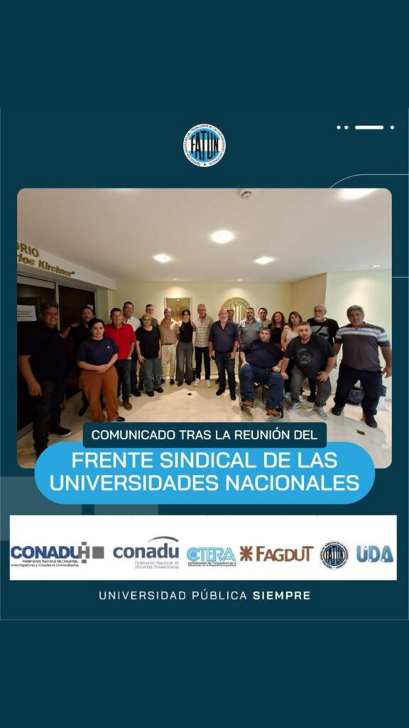 Compartimos comunicado del Frente Sindical de Universidades Nacionales, del cual formamos parte, en rechazo a la Reforma Laboral y a la Modificación de la Ley de Financiamiento Universitario, luego de la reunión realizada ayer en nuestra Sede Central en la CABA. “El Frente Sindical de Universidades Nacionales rechaza el de reforma laboral y exige la […]