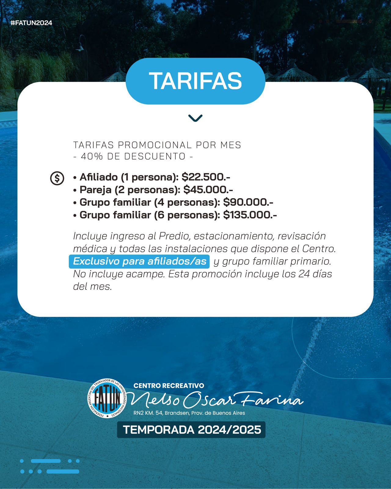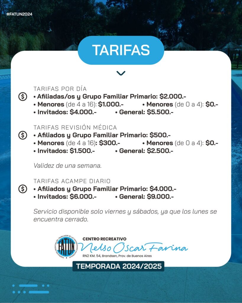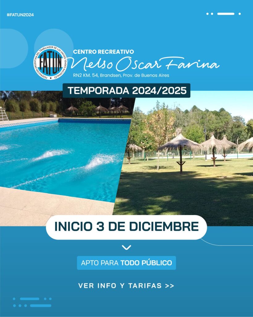 Informamos que a partir del próximo 3 de diciembre, abrirá sus puertas el Centro Recreativo «Nelso Oscar Farina”, ubicado en el KM 54 de la localidad de Brandsen, dando inicio oficialmente a la temporada 2024/25 del predio.