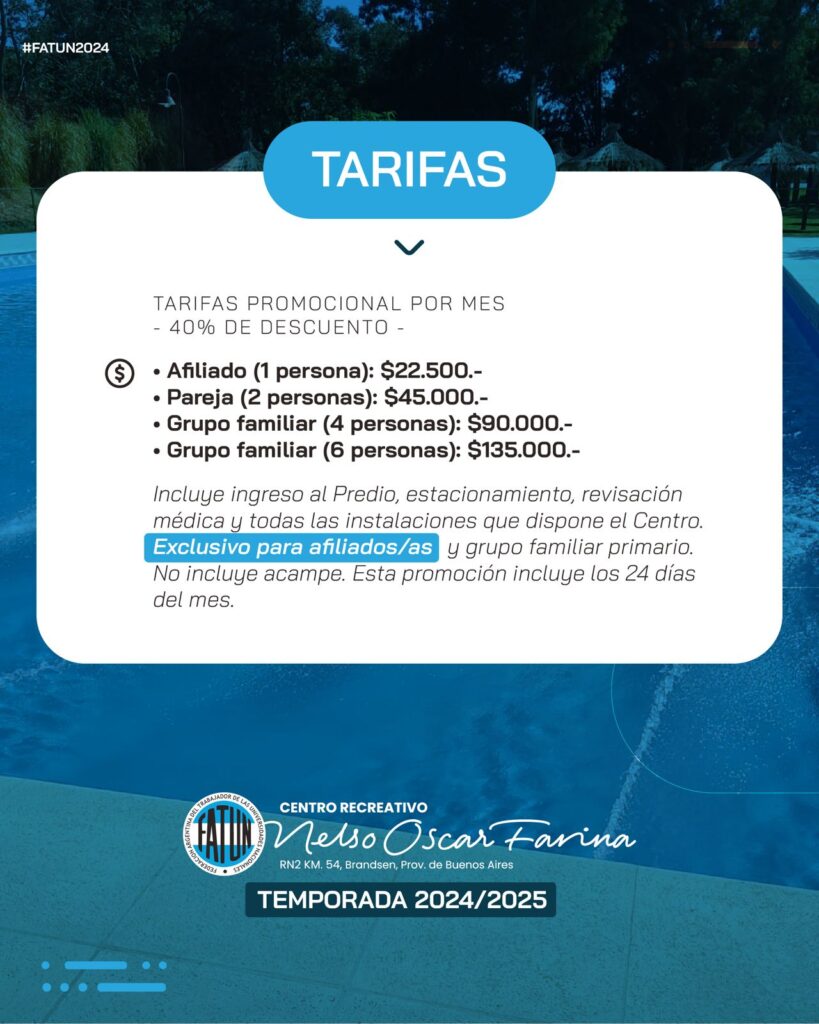 Compartimos en placas el cuadro tarifario para el acceso a piscina, el acampe durante los fines de semana y el costo de la promoción por pago mensual (exclusivo para los/as afiliados/as). Asimismo hacemos saber que el predio estará abierto de martes a domingos, con acceso para todo público, tanto para NODOCENTES, como para invitados, como para público en general.