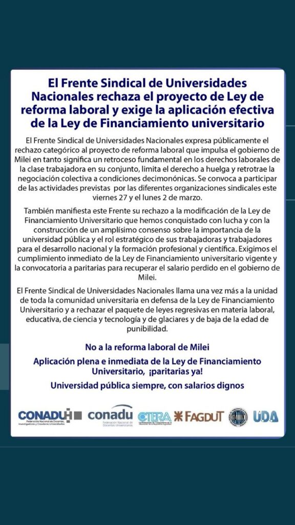 El Frente Sindical de Universidades Nacionales expresa públicamente el rechazo categórico al proyecto de reforma laboral que impulsa el gobierno de Milei en tanto significa un retroceso fundamental en los derechos laborales de la clase trabajadora en su conjunto, limita el derecho a huelga y retrotrae la negociación colectiva a condiciones decimonónicas. Se convoca a participar de los paros, movilizaciones y delas actividades previstas por las diferentes organizaciones sindicales este viernes 27.