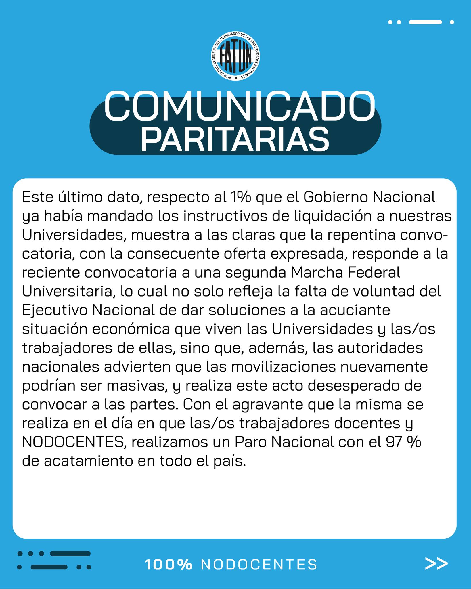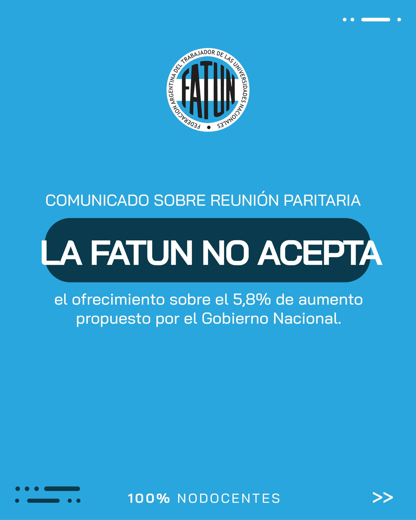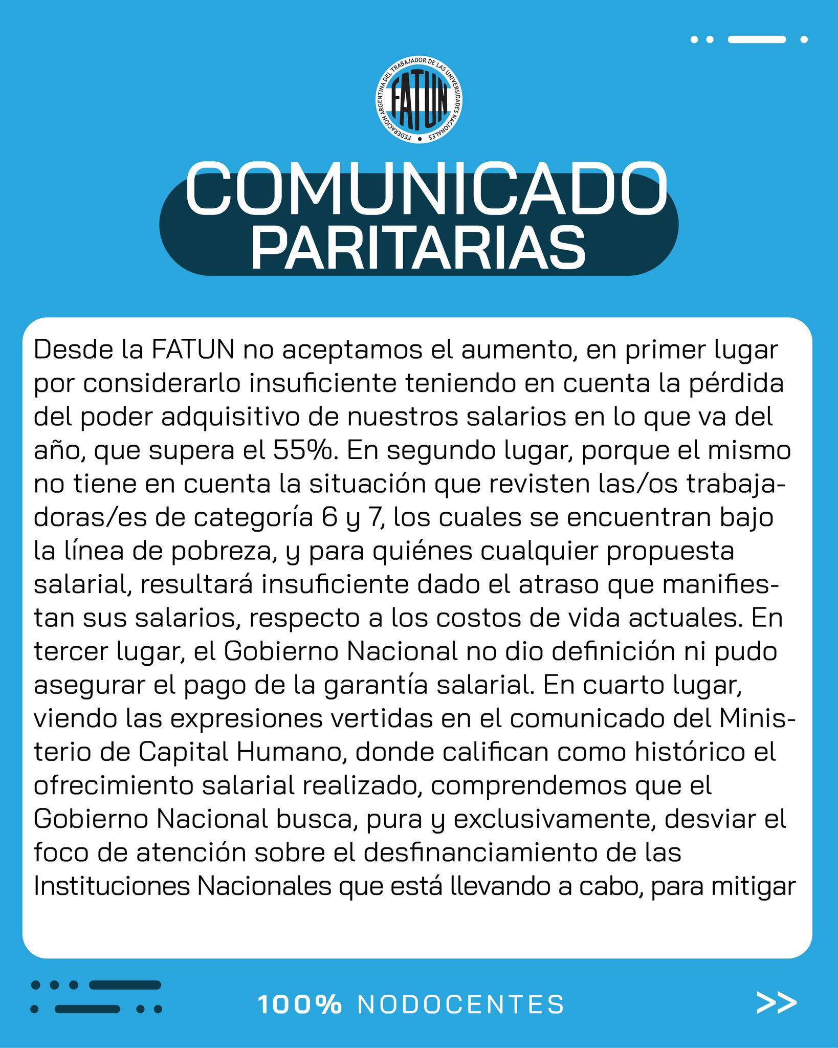 Desde la FATUN no aceptamos el aumento, en primer lugar por considerarlo insuficiente teniendo en cuenta la pérdida del poder adquisitivo de nuestros salarios en lo que va del año, que supera el 55%. En segundo lugar, porque el mismo no tiene en cuenta la situación que revisten las/os trabajadoras/es de categoría 6 y 7, los cuales se encuentran bajo la línea de pobreza, y para quiénes cualquier propuesta salarial, resultará insuficiente dado el atraso que manifiestan sus salarios, respecto a los costos de vida actuales. En tercer lugar, el Gobierno Nacional no dio definición ni pudo asegurar el pago de la garantía salarial. En cuarto lugar, viendo las expresiones vertidas en el comunicado del Ministerio de Capital Humano, donde califican como histórico el ofrecimiento salarial realizado, comprendemos que el Gobierno Nacional busca, pura y exclusivamente, desviar el foco de atención sobre el desfinanciamiento de las Instituciones Nacionales que está llevando a cabo, para mitigar los costos políticos de sus acciones, en lugar de encontrar soluciones verdaderas a problemas del financiamiento de las Universidades Públicas.