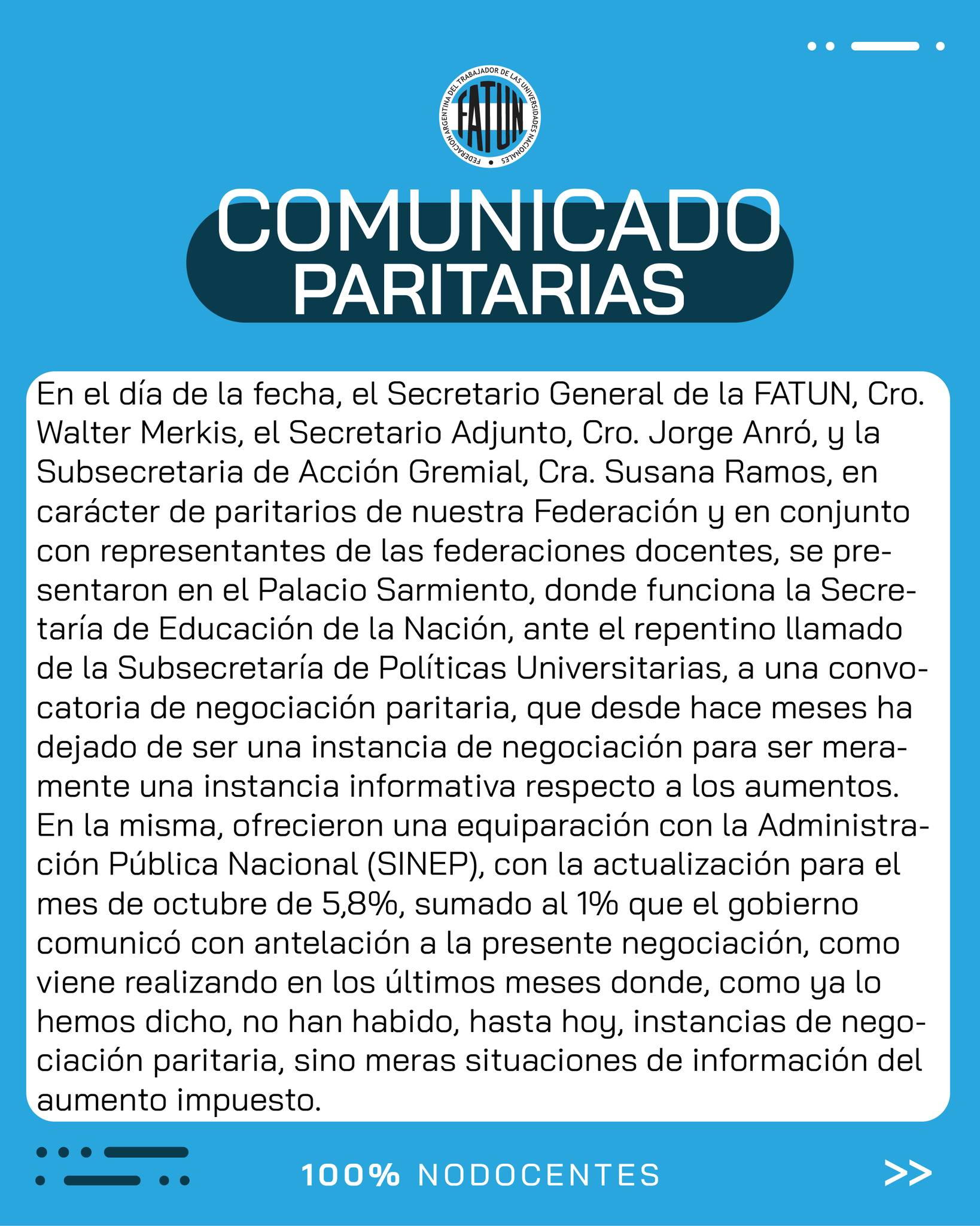 En el día de la fecha, el Secretario General de la FATUN, Cro. Walter Merkis, el Secretario Adjunto, Cro. Jorge Anró, y la Subsecretaria de Acción Gremial, Cra. Susana Ramos, en carácter de paritarios de nuestra Federación y en conjunto con representantes de las federaciones docentes, se presentaron en el Palacio Sarmiento, donde funciona la Secretaría de Educación de la Nación, ante el repentino llamado de la Subsecretaría de Políticas Universitarias, a una convocatoria de negociación paritaria, que desde hace meses ha dejado de ser una instancia de negociación para ser meramente una instancia informativa respecto a los aumentos. En la misma, ofrecieron una equiparación con la Administración Pública Nacional (SINEP), con la actualización para el mes de octubre de 5,8%, sumado al 1% que el gobierno comunicó con antelación a la presente negociación, como viene realizando en los últimos meses donde, como ya lo hemos dicho, no han habido, hasta hoy, instancias de negociación paritaria, sino meras situaciones de información del aumento impuesto.