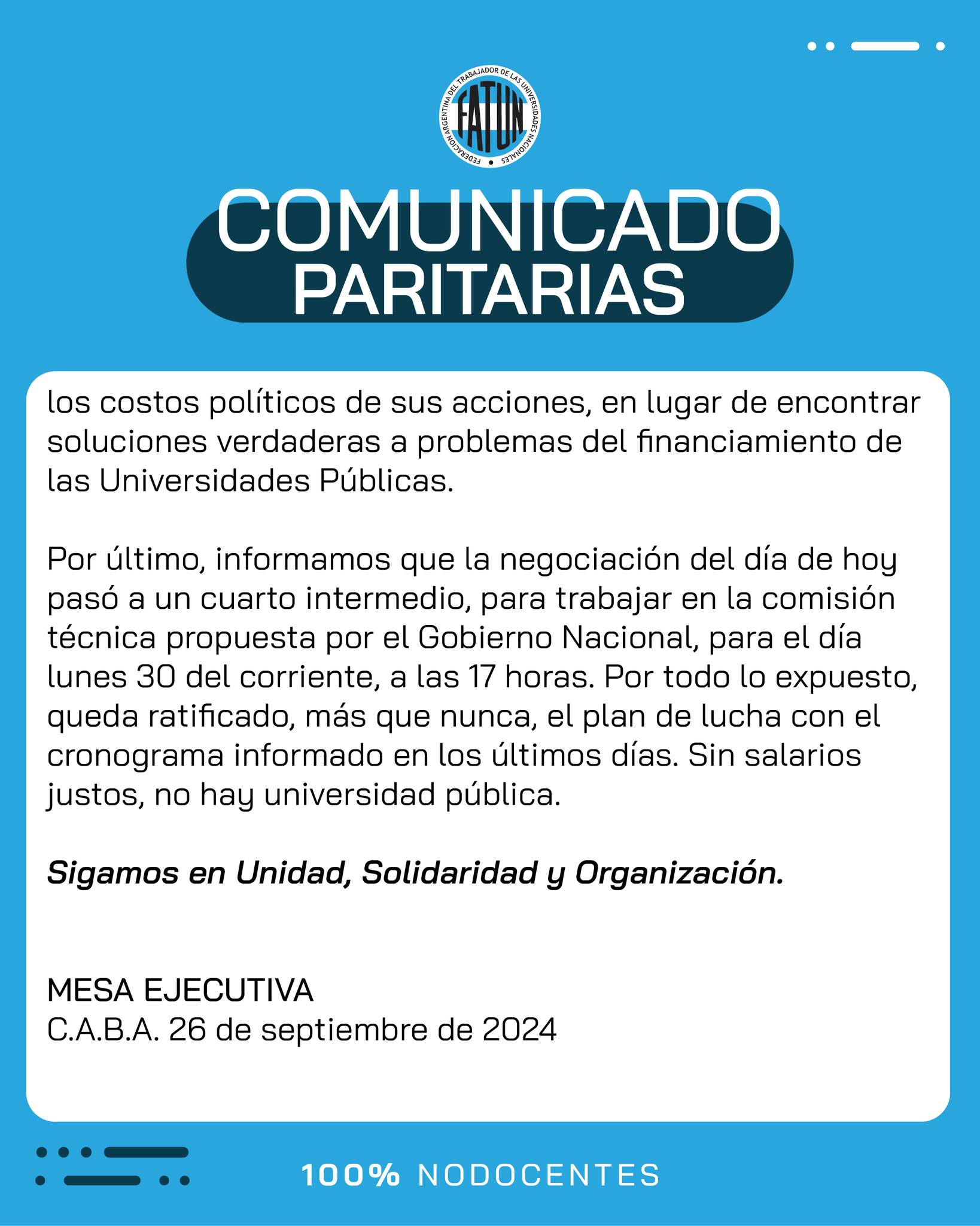 Por último, informamos que la negociación del día de hoy pasó a un cuarto intermedio, para trabajar en la comisión técnica propuesta por el Gobierno Nacional, para el día lunes 30 del corriente, a las 17 horas. Por todo lo expuesto, queda ratificado, más que nunca, el plan de lucha con el cronograma informado en los últimos días. Sin salarios justos, no hay universidad pública. Sigamos en Unidad, Solidaridad y Organización.