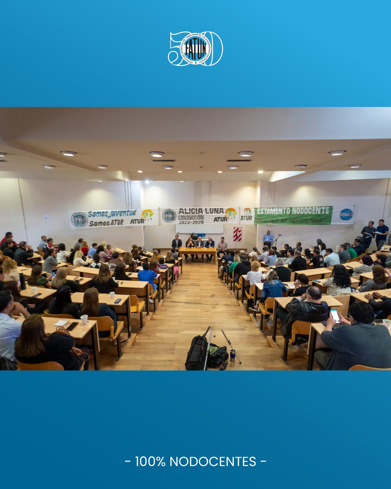 Al día siguiente, en el Anfiteatro “B” de la misma Universidad, se realizó la charla “Nuestro CCT, Modelo Sindical y Universitario Argentino” para toda la familia NODOCENTE, dándose también a conocer las Resoluciones Rectorales, sobre los resultados de los 1° Concursos de Ascenso NODOCENTES de esta Casa de Altos Estudios.