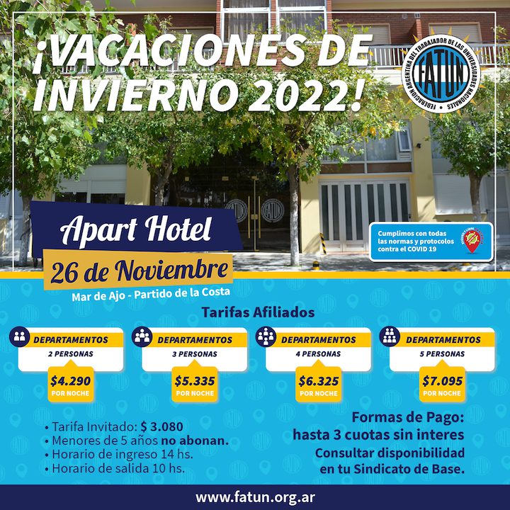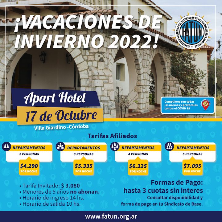 Cabe recordar, que la FATUN cuenta con hoteles en Santa Rosa de Calamuchita, Córdoba; Villa Giardino, también en la provincia mediterránea; y en Mar de Ajó, en la costa atlántica.