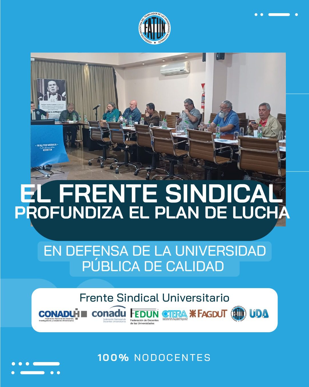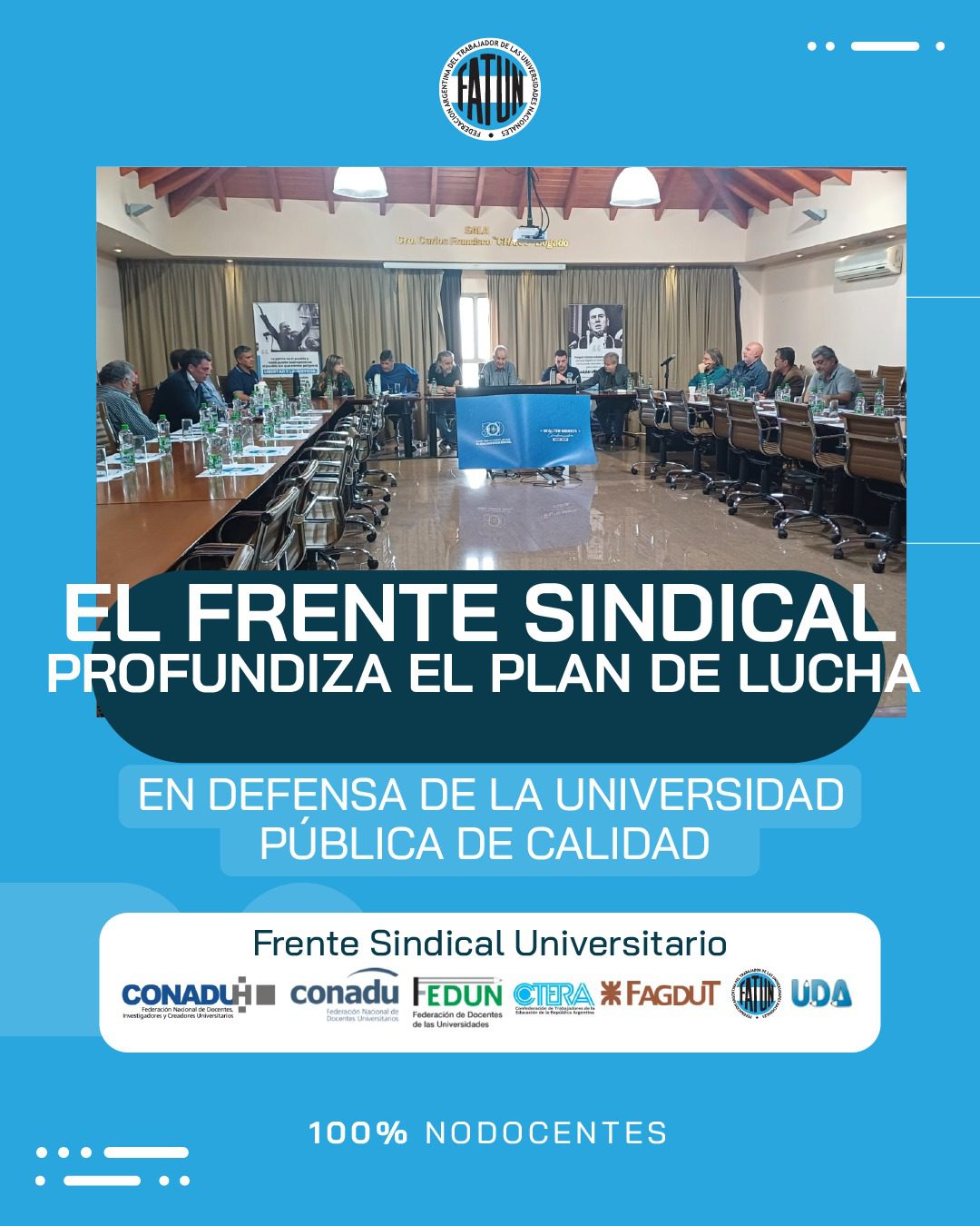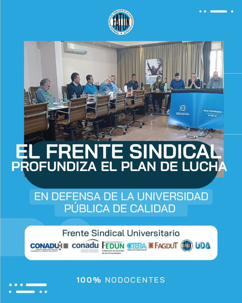 En el día de hoy, en la sede central de nuestra Federación, y en el marco del paro total de actividades, el Frente Sindical de Universidades Nacionales analizó la continuidad del plan de lucha articulando con autoridades y estudiantes, ante la ratificación del veto a la Ley De Financiamiento Universitario.