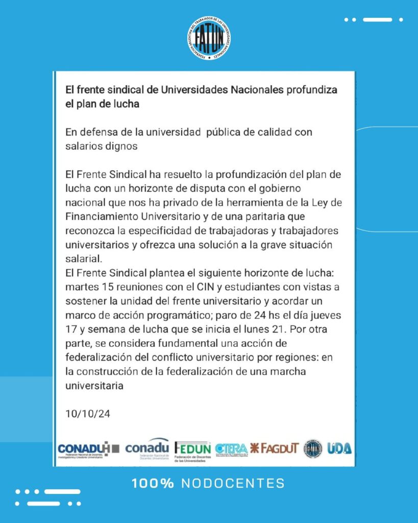 El objetivo es profundizar el plan de acción con un horizonte de disputa con el Gobierno Nacional. Para dicho fin, el Frente plantea para el próximo martes 15 de octubre una reunión con el CIN y la FUA con vistas a sostener la unidad del frente universitario y acordar un marco de acción programático, seguido de un PARO de 24 horas, sin cocurrencia, para el próximo jueves 17 de octubre.