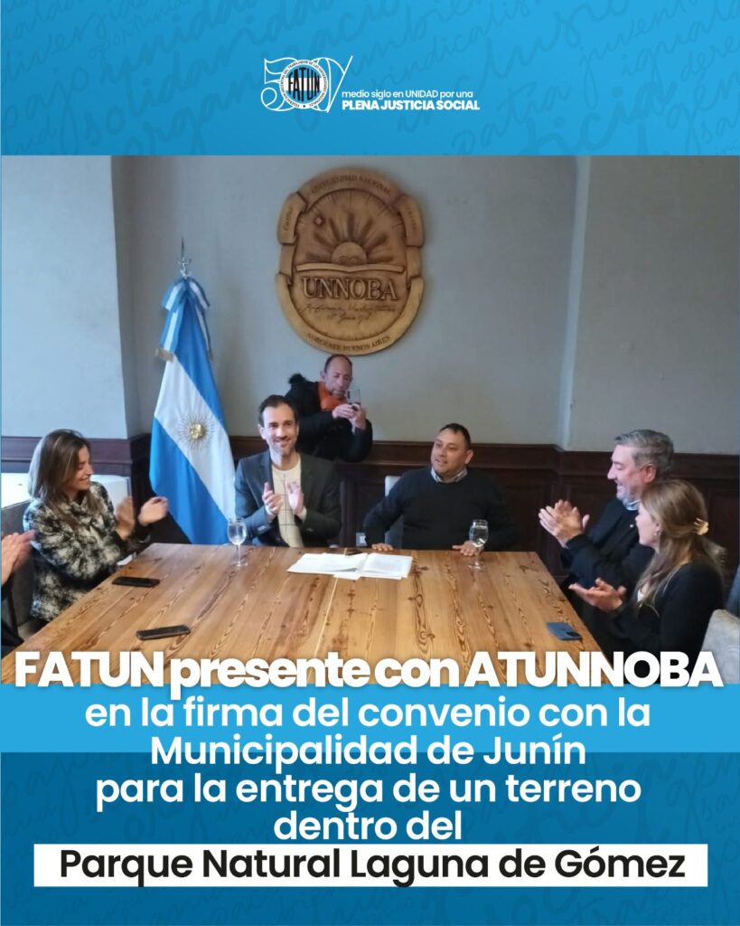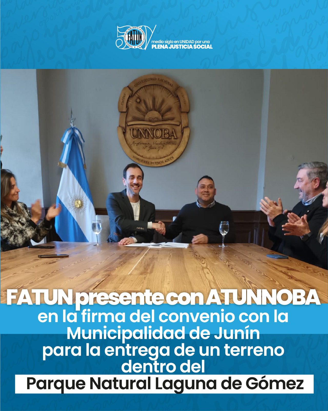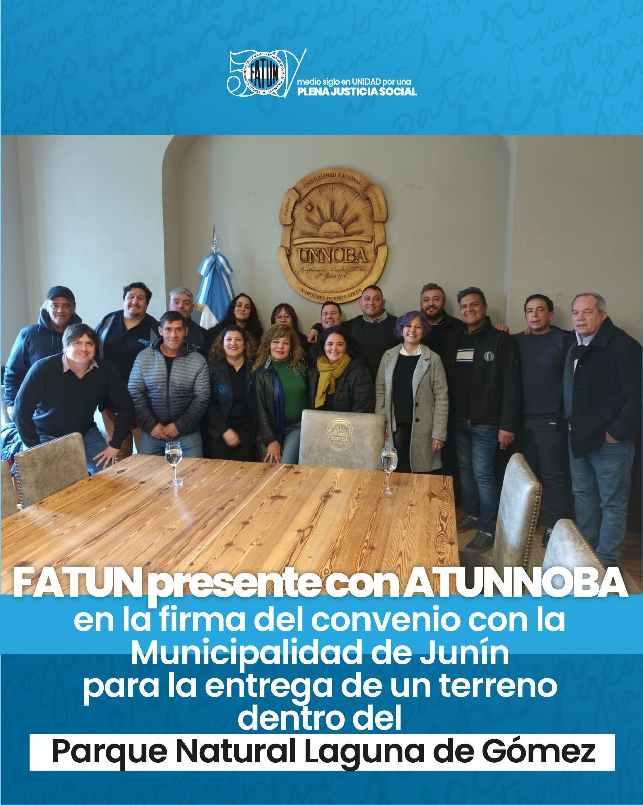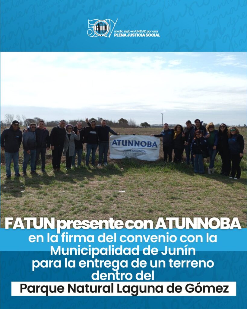 En el día de la fecha, y por indicación del Secretario General, Cro. Walter Merkis, el Secretario de Bienestar y Vivienda, Cro. Facundo Romero, el Subsecretario del Interior, Cro. José Ojeda, y el Secretario General de ATUNNOBA, junto con compañeros de dicho sindicato de base y de Quilmes, Luján, San Martín y Tres de Febrero, estuvieron presentes en la firma del convenio con la Municipalidad de Junín para la entrega de un terreno dentro del Parque Natural Laguna de Gómez, con el fin de que las/os NODOCENTES afiliadas/os a ATUNNOBA puedan tener un predio propio dentro del lugar turístico más importante del Noroeste Bonaerense.
