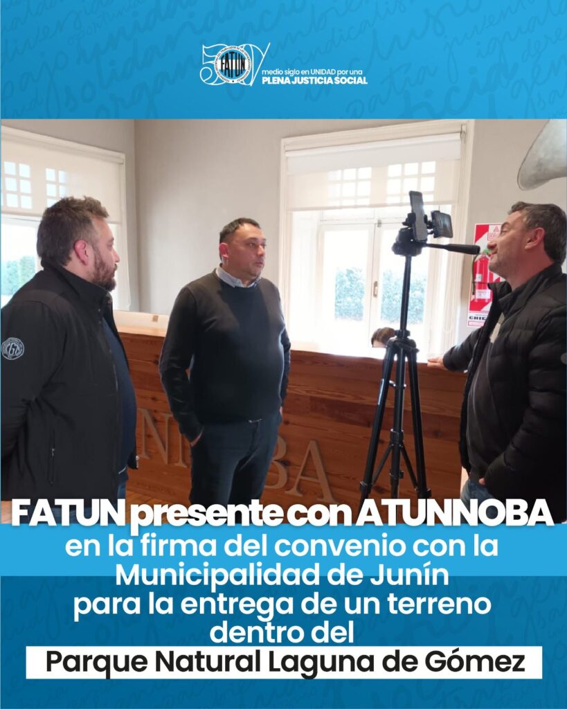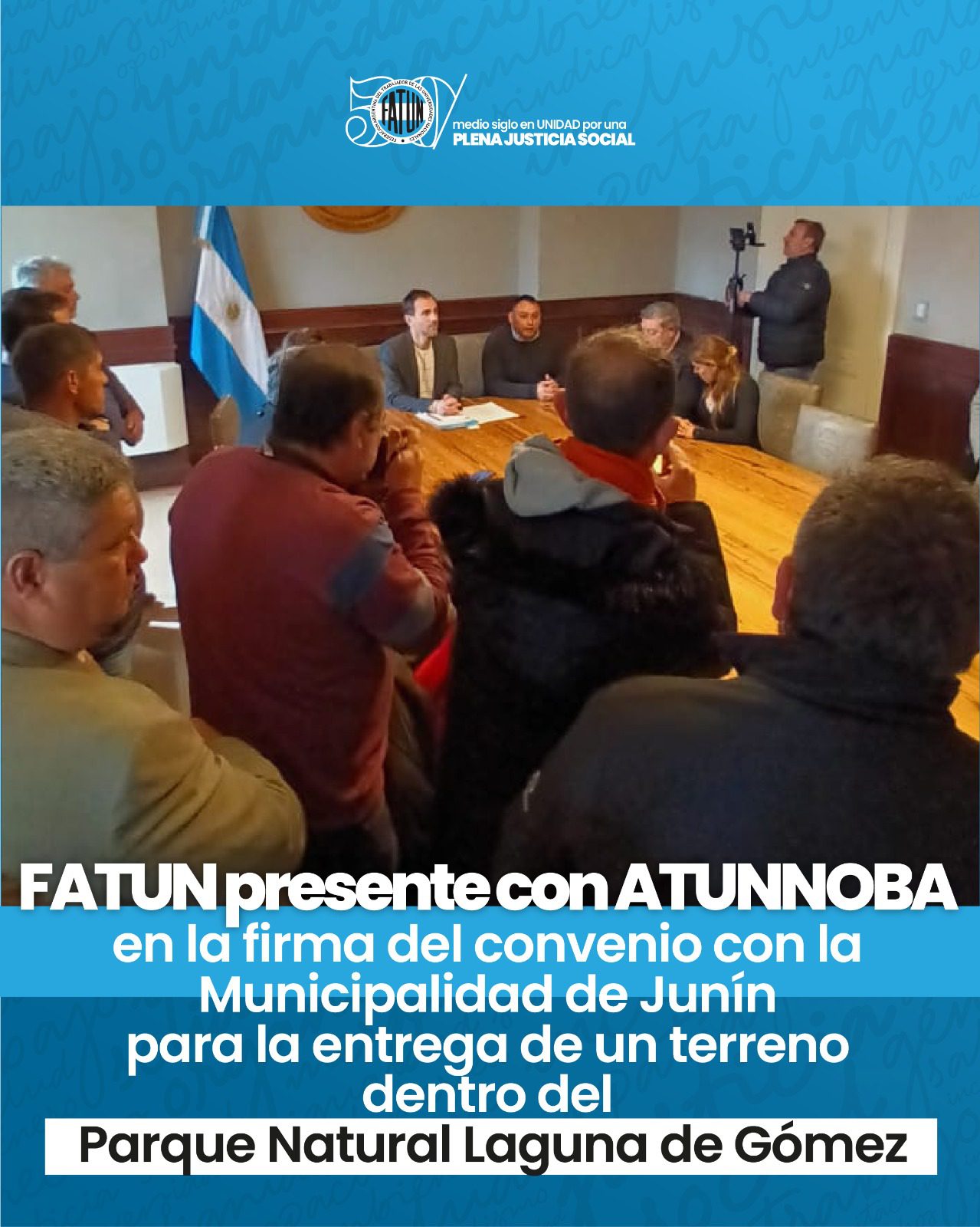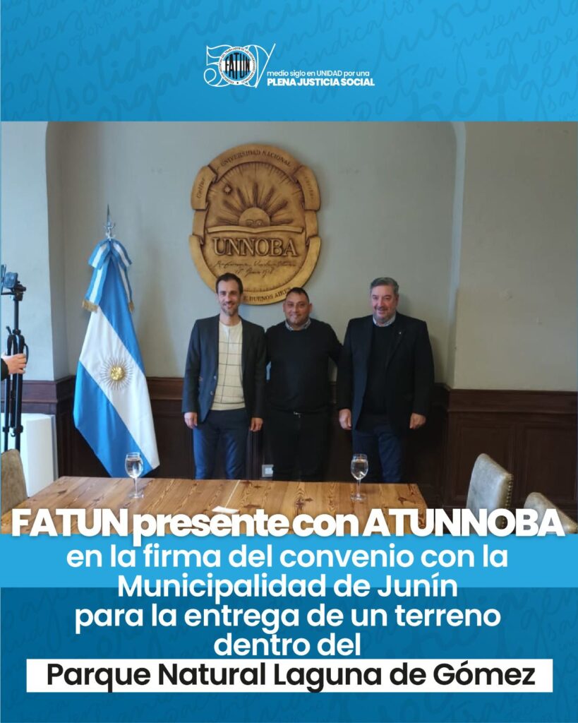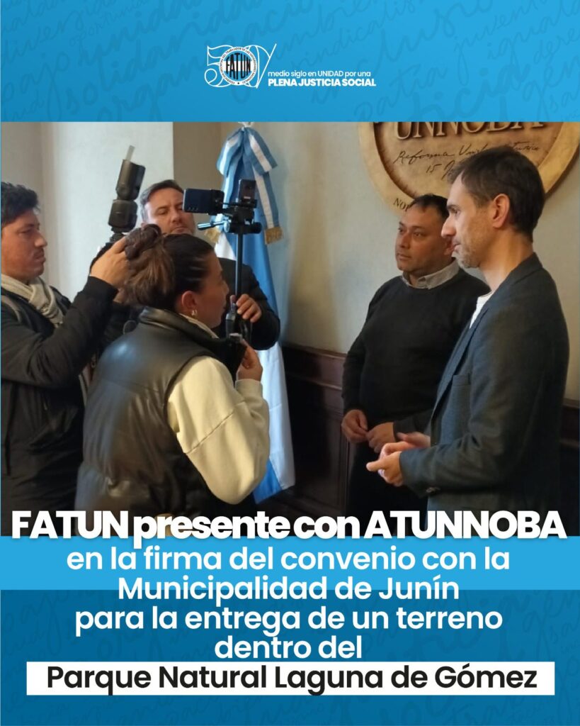 En el día de la fecha, y por indicación del Secretario General, Cro. Walter Merkis, el Secretario de Bienestar y Vivienda, Cro. Facundo Romero, el Subsecretario del Interior, Cro. José Ojeda, y el Secretario General de ATUNNOBA, junto con compañeros de dicho sindicato de base y de Quilmes, Luján, San Martín y Tres de Febrero, estuvieron presentes en la firma del convenio con la Municipalidad de Junín para la entrega de un terreno dentro del Parque Natural Laguna de Gómez, con el fin de que las/os NODOCENTES afiliadas/os a ATUNNOBA puedan tener un predio propio dentro del lugar turístico más importante del Noroeste Bonaerense.