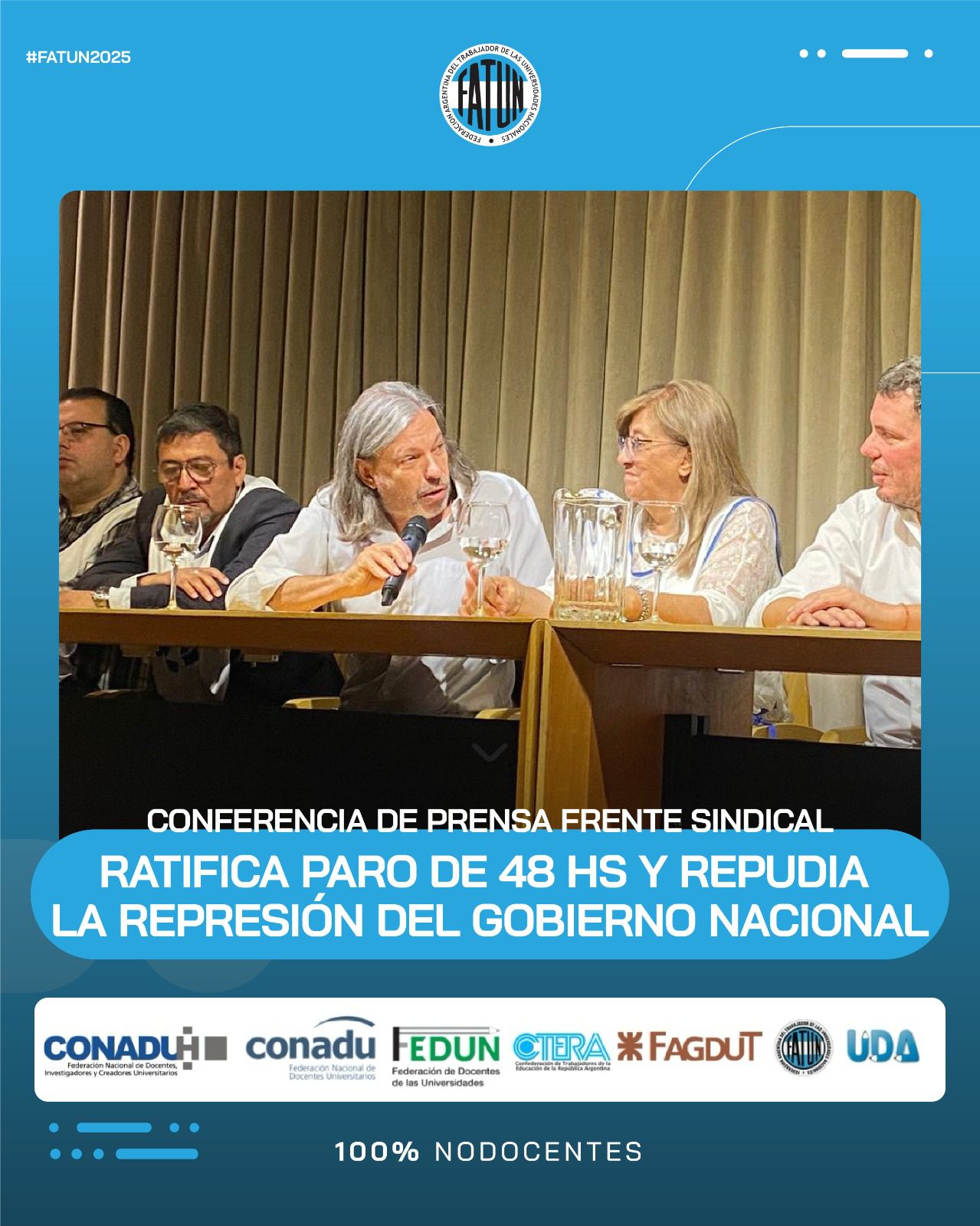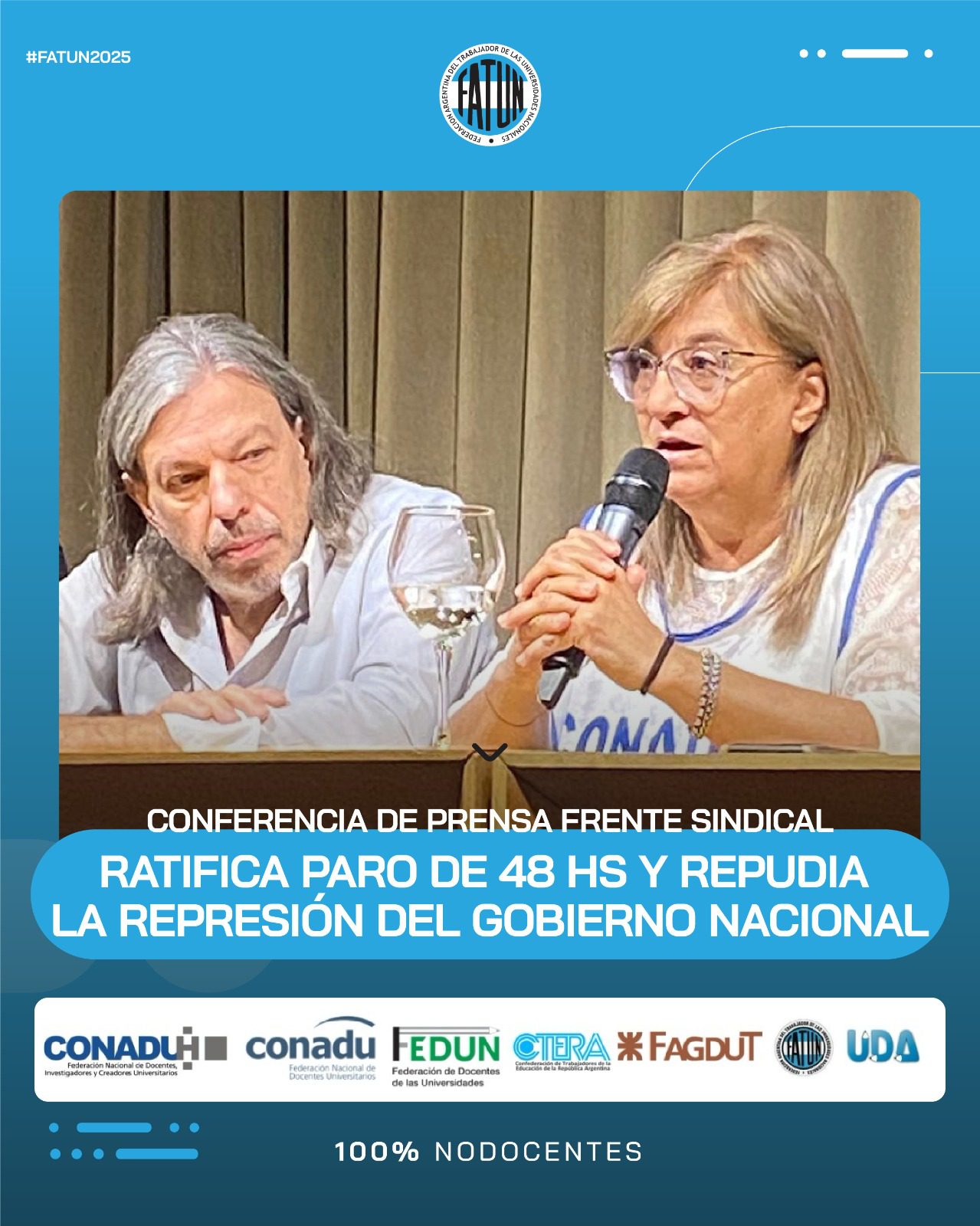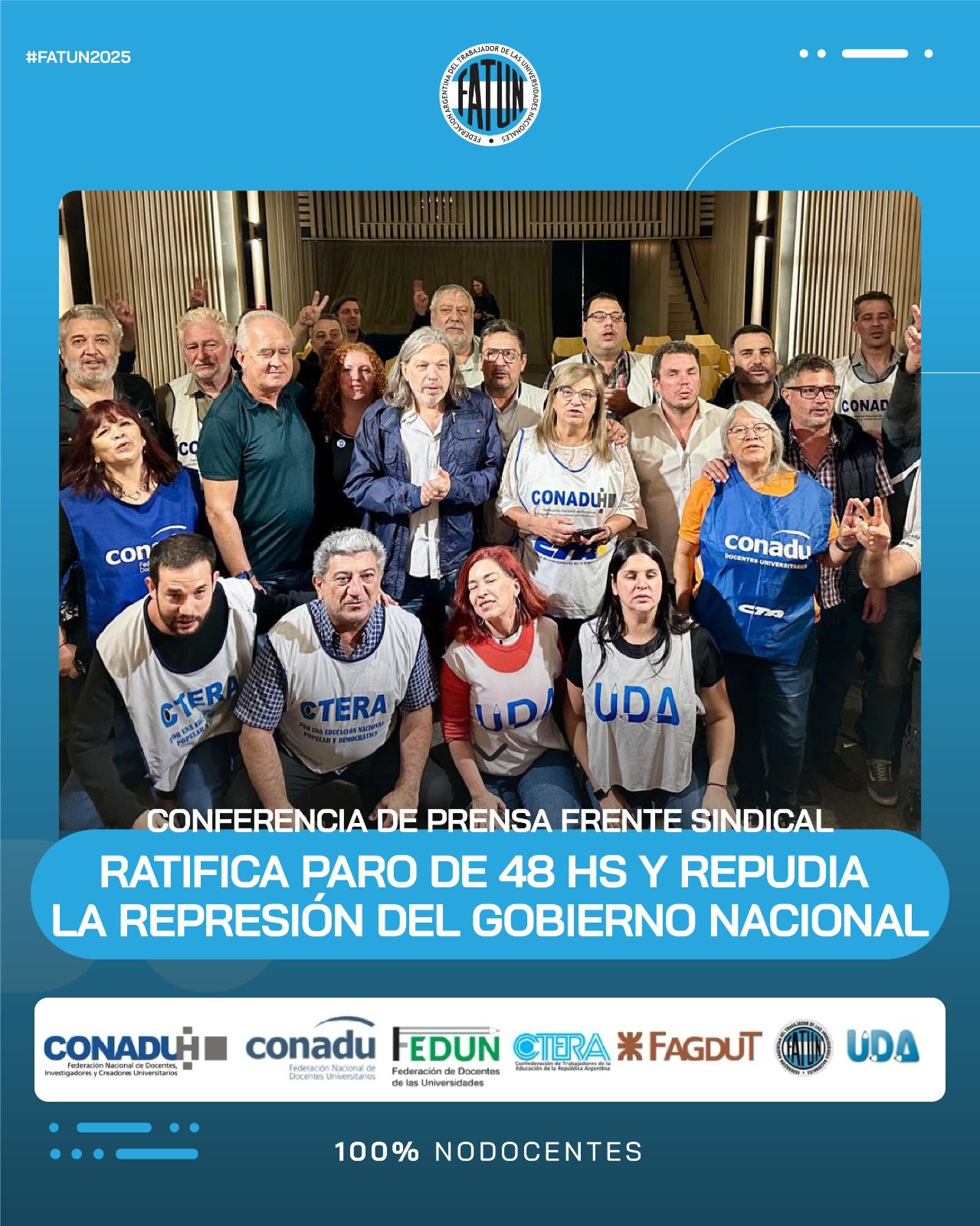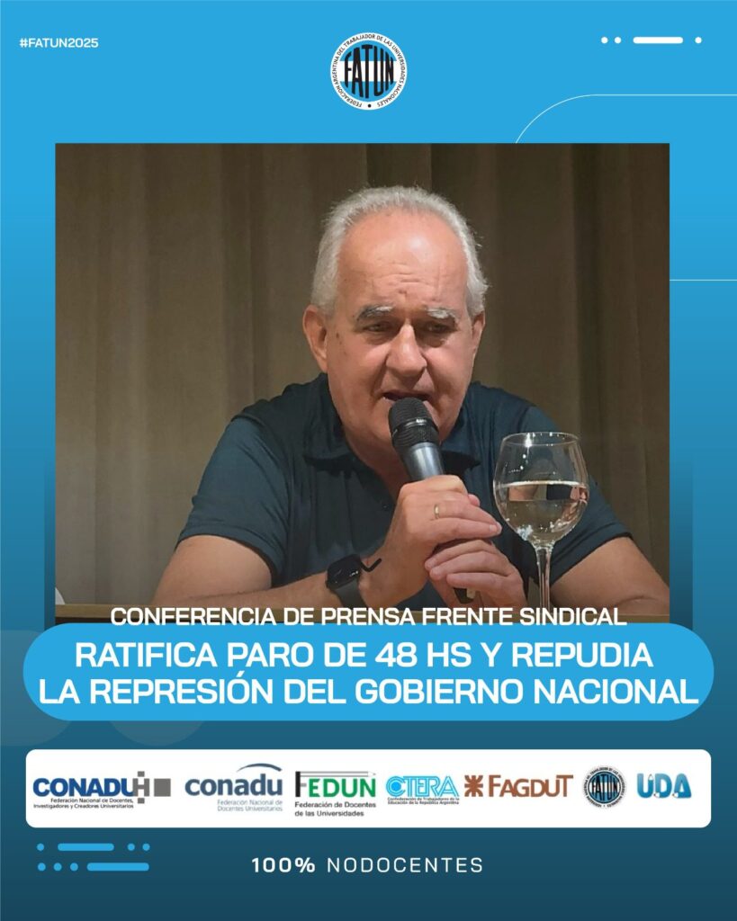 En el día de la fecha se llevó a cabo, en las instalaciones de CONADU, una conferencia de prensa convocada por el Frente Sindical de Universidades Nacionales, del cual la FATUN forma parte, en donde, como principal eje, se comunicó la ratificación de la unidad del Frente, en el que nos encontramos los representantes sindicales de las trabajadoras y trabajadores docentes y NODOCENTES de las Universidades Nacionales (FATUN, CONADU, CONADU Histórica, FEDUN, CTERA, FAGDUT y UDA). De esta manera se confirma que seguiremos realizando acciones conjuntas. La primera de ellas, dándole continuidad a las ya realizadas durante el 2024, será el PARO DE 48HS del próximo 17 y 18 de marzo y las manifestaciones en cada punto del país durante esos días.