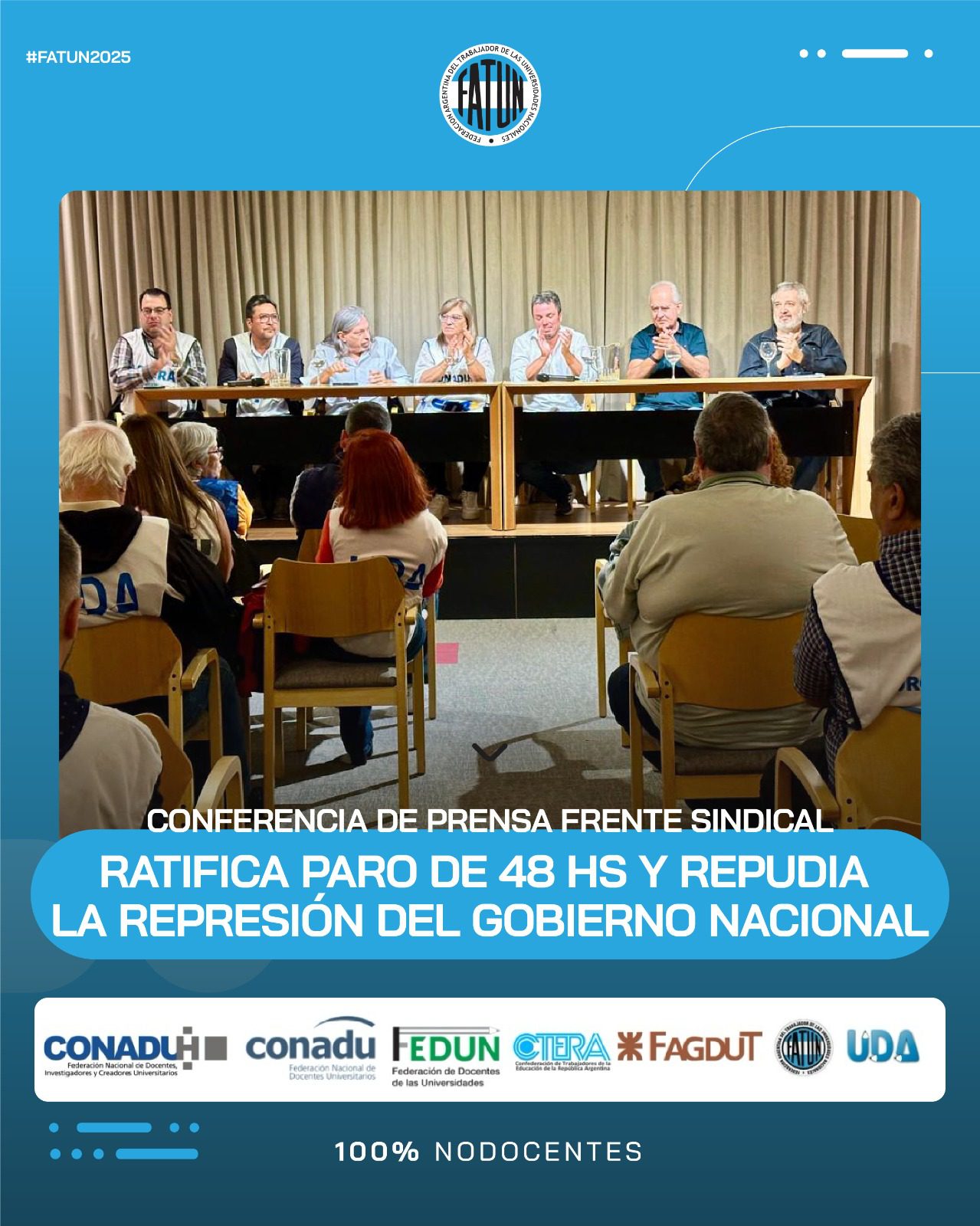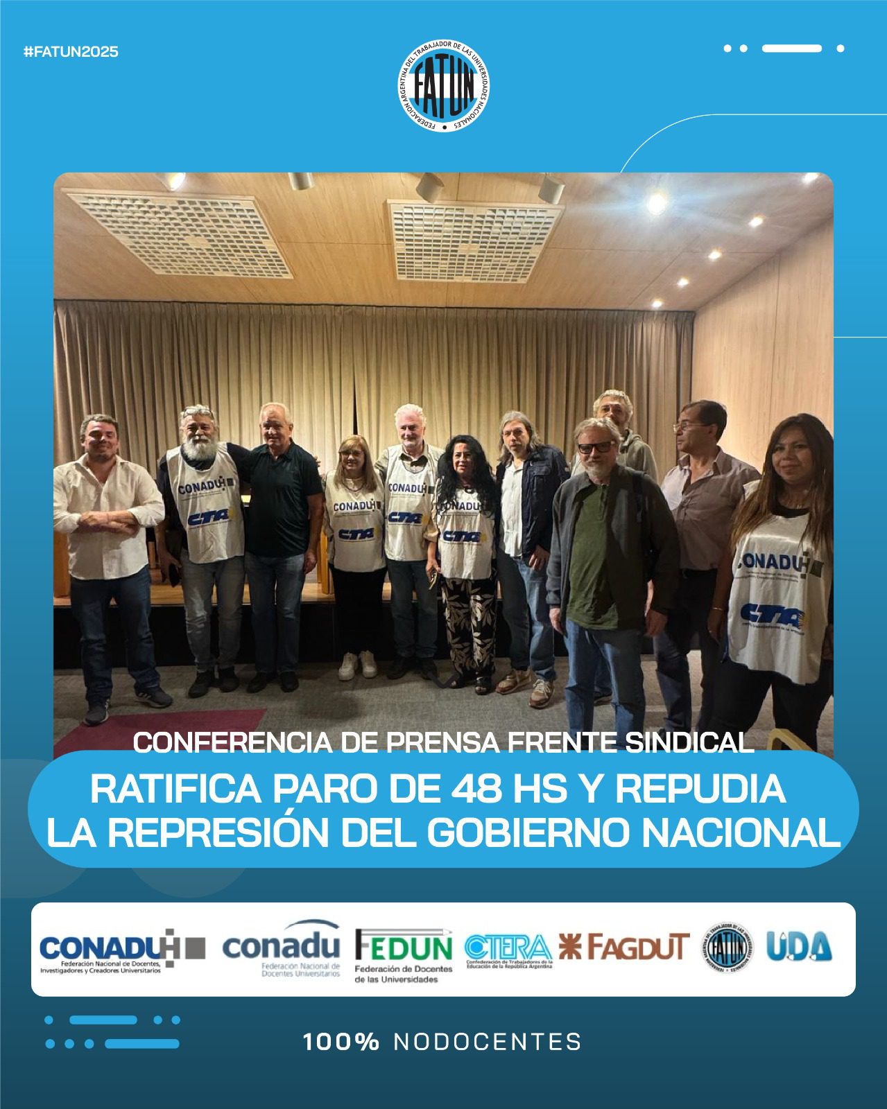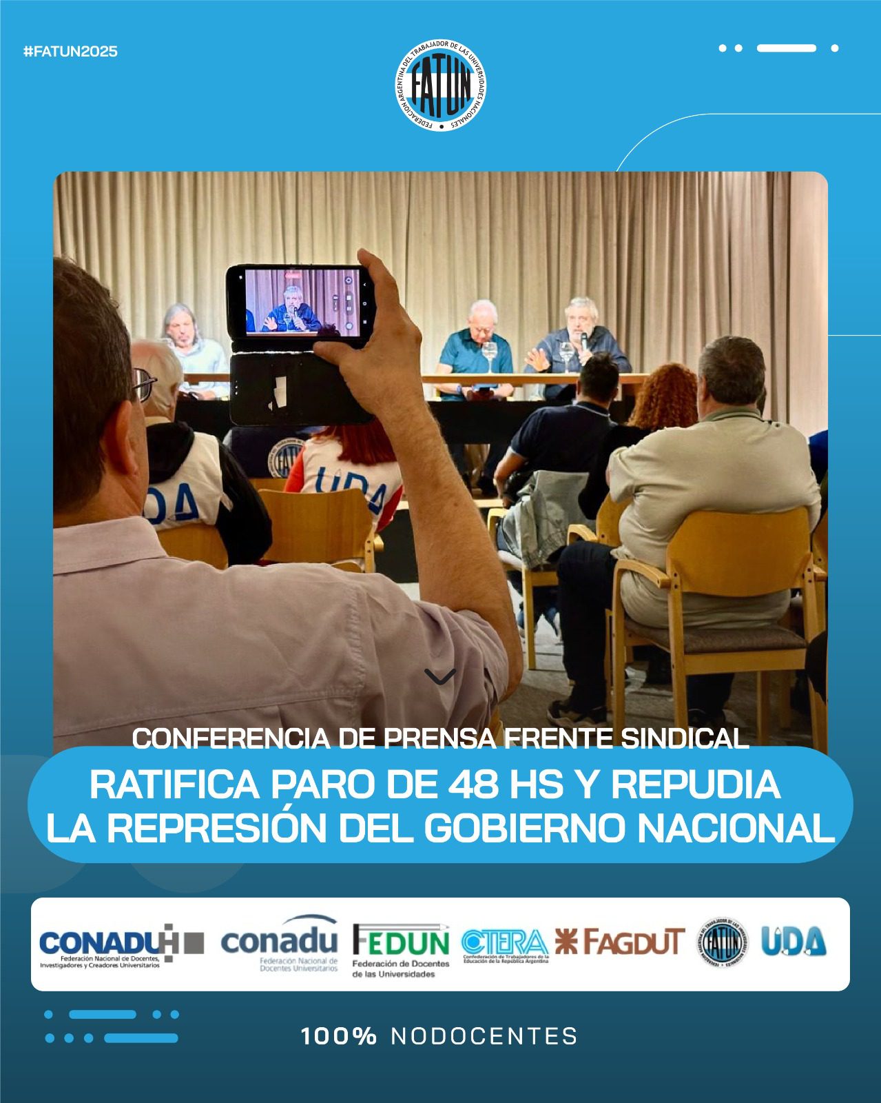 En el día de la fecha se llevó a cabo, en las instalaciones de CONADU, una conferencia de prensa convocada por el Frente Sindical de Universidades Nacionales, del cual la FATUN forma parte, en donde, como principal eje, se comunicó la ratificación de la unidad del Frente, en el que nos encontramos los representantes sindicales de las trabajadoras y trabajadores docentes y NODOCENTES de las Universidades Nacionales (FATUN, CONADU, CONADU Histórica, FEDUN, CTERA, FAGDUT y UDA). De esta manera se confirma que seguiremos realizando acciones conjuntas. La primera de ellas, dándole continuidad a las ya realizadas durante el 2024, será el PARO DE 48HS del próximo 17 y 18 de marzo y las manifestaciones en cada punto del país durante esos días.