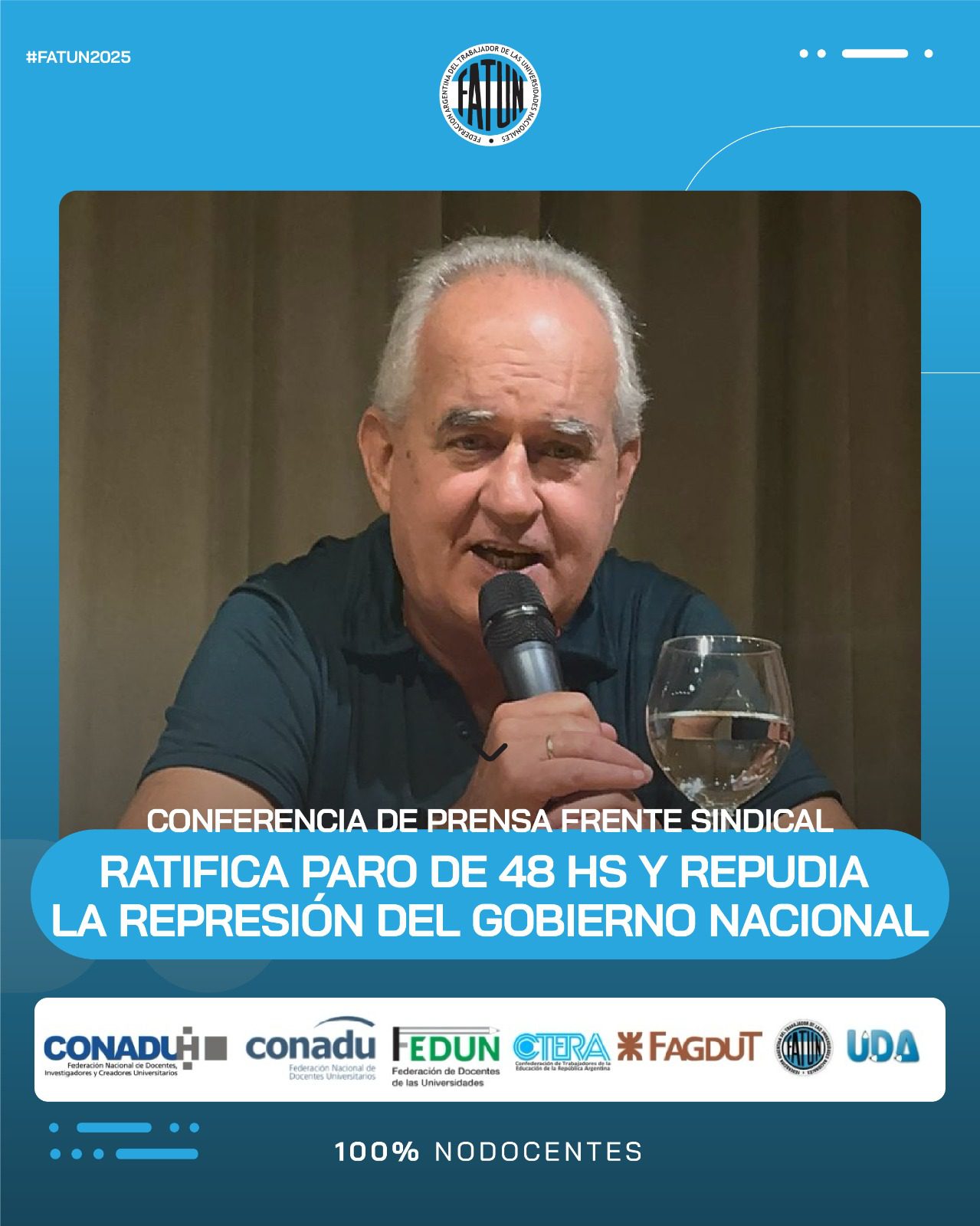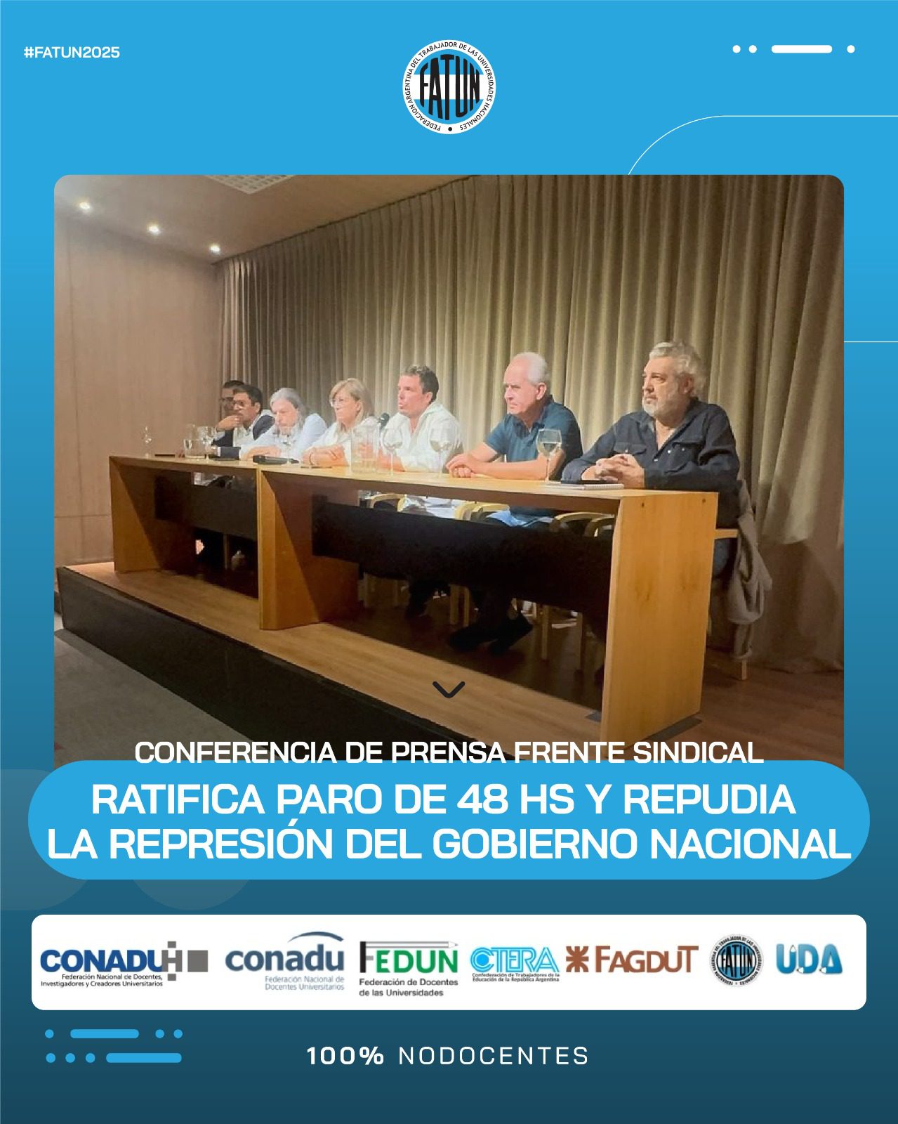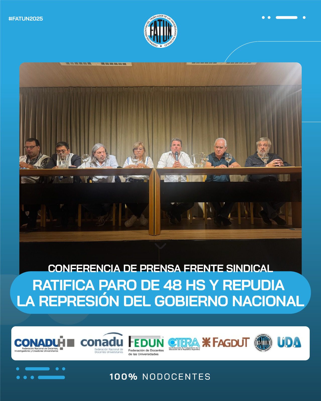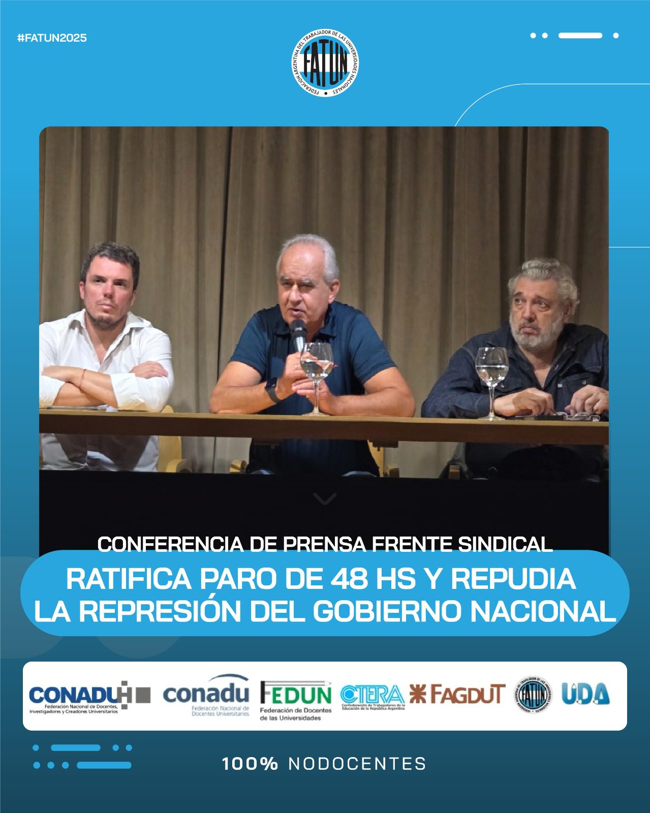 En el día de la fecha se llevó a cabo, en las instalaciones de CONADU, una conferencia de prensa convocada por el Frente Sindical de Universidades Nacionales, del cual la FATUN forma parte, en donde, como principal eje, se comunicó la ratificación de la unidad del Frente, en el que nos encontramos los representantes sindicales de las trabajadoras y trabajadores docentes y NODOCENTES de las Universidades Nacionales (FATUN, CONADU, CONADU Histórica, FEDUN, CTERA, FAGDUT y UDA). De esta manera se confirma que seguiremos realizando acciones conjuntas. La primera de ellas, dándole continuidad a las ya realizadas durante el 2024, será el PARO DE 48HS del próximo 17 y 18 de marzo y las manifestaciones en cada punto del país durante esos días.