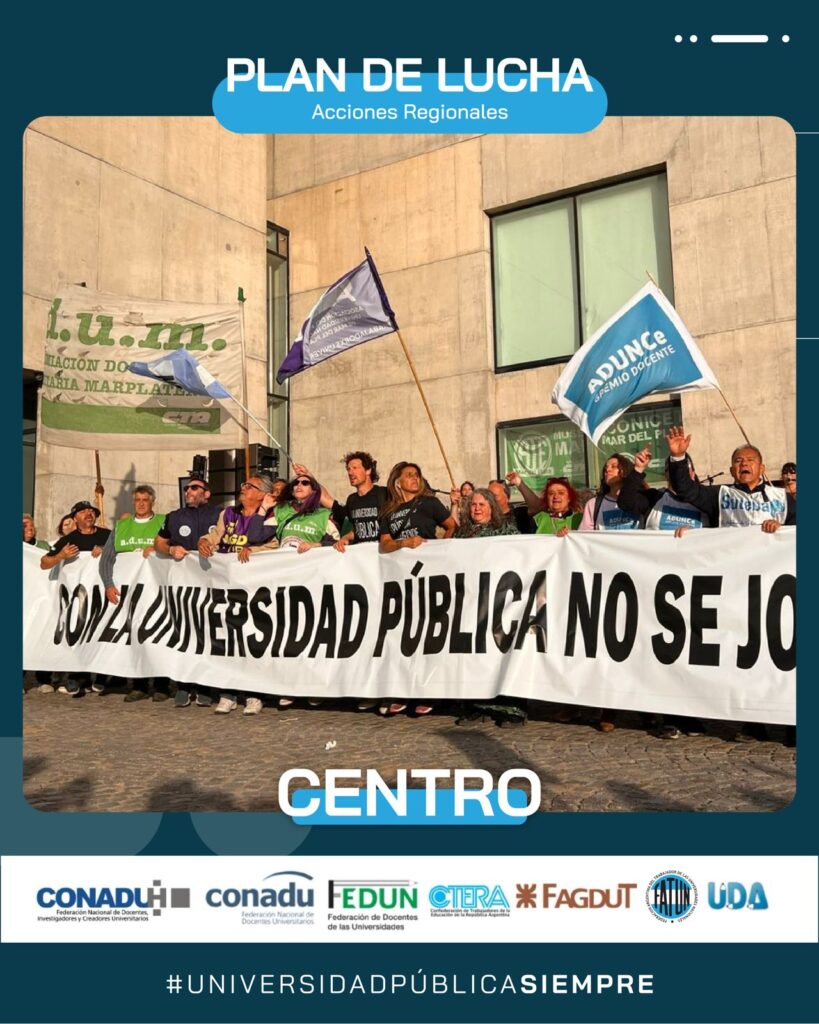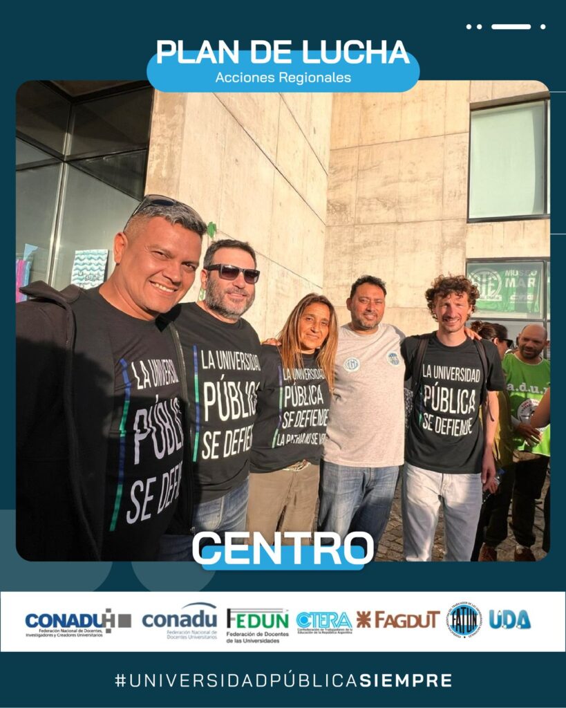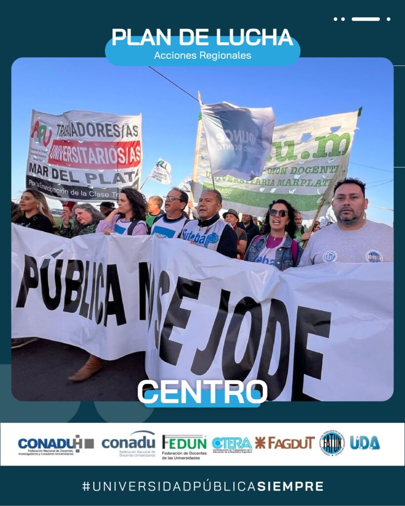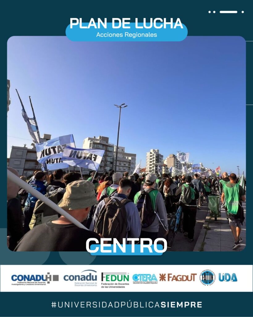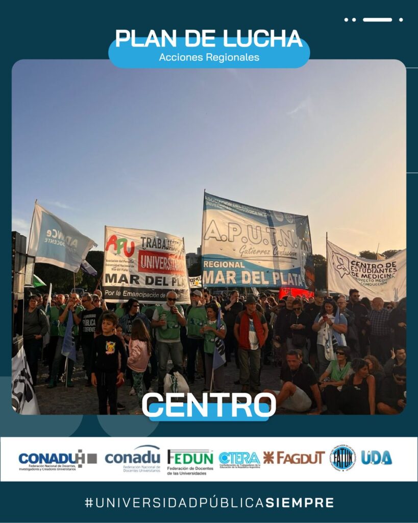 Ayer se llevó a cabo. en la ciudad de Mar del Plata, la Marcha Regional de Universidades de la Región Centro, en defensa de la Universidad Pública. Por indicación de nuestro Secretario General, Cro. Walter Merkis, asistieron en representación de la FATUN el Secretario de Organización, Cro. Mauricio D’Alessandro, y el Secretario del Interior, Cro. José Ojeda, junto al Consejero Directivo, Cro. Jorge Mendoza, quienes fueron recibidos por la Secretaria General de la APU Mar del Plata, Cra. Victoria Schadwill.
