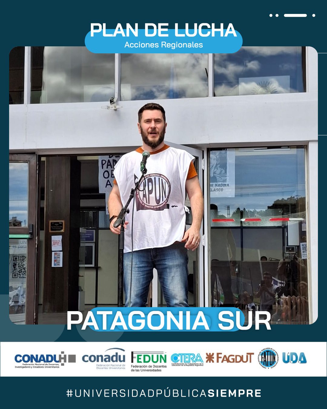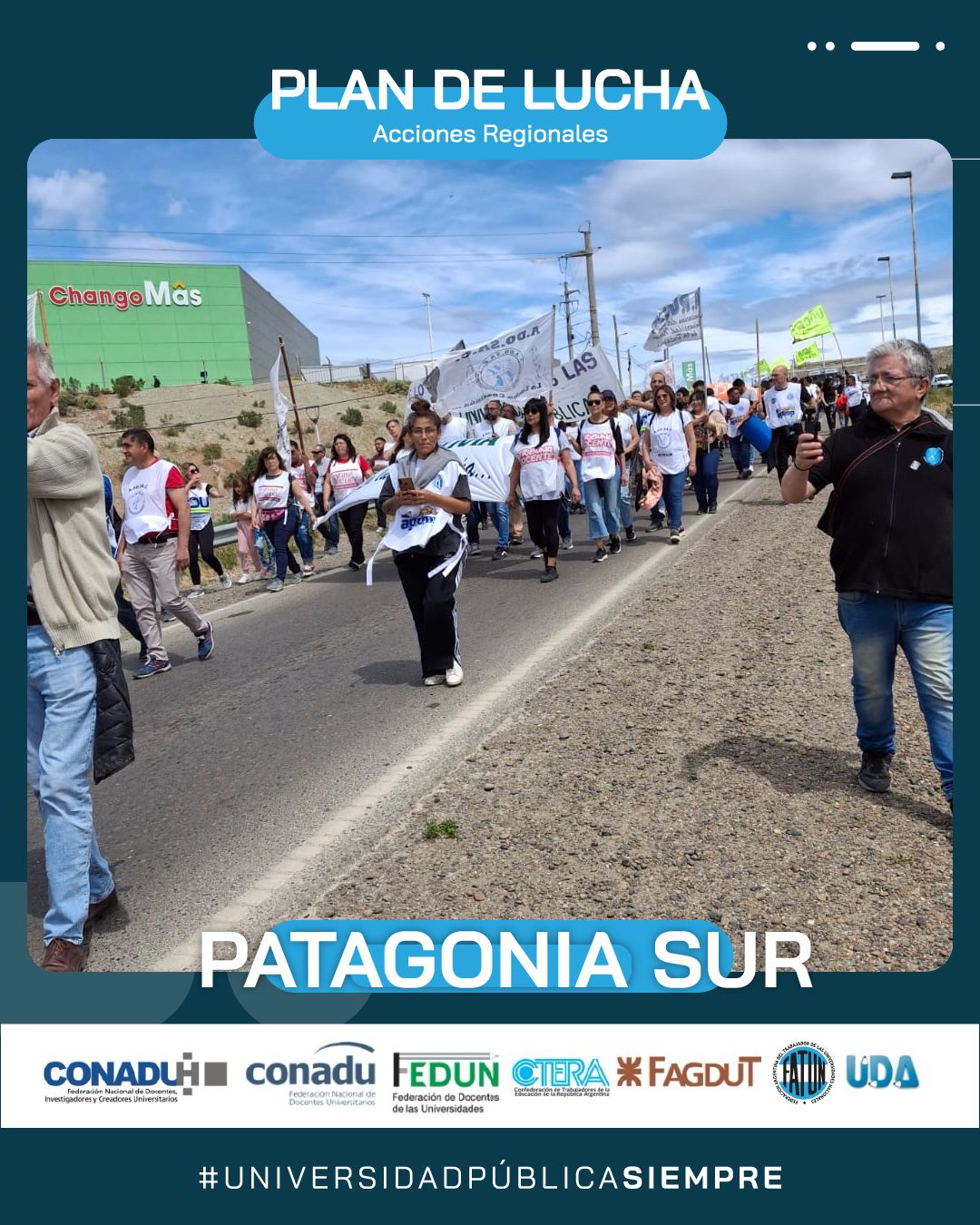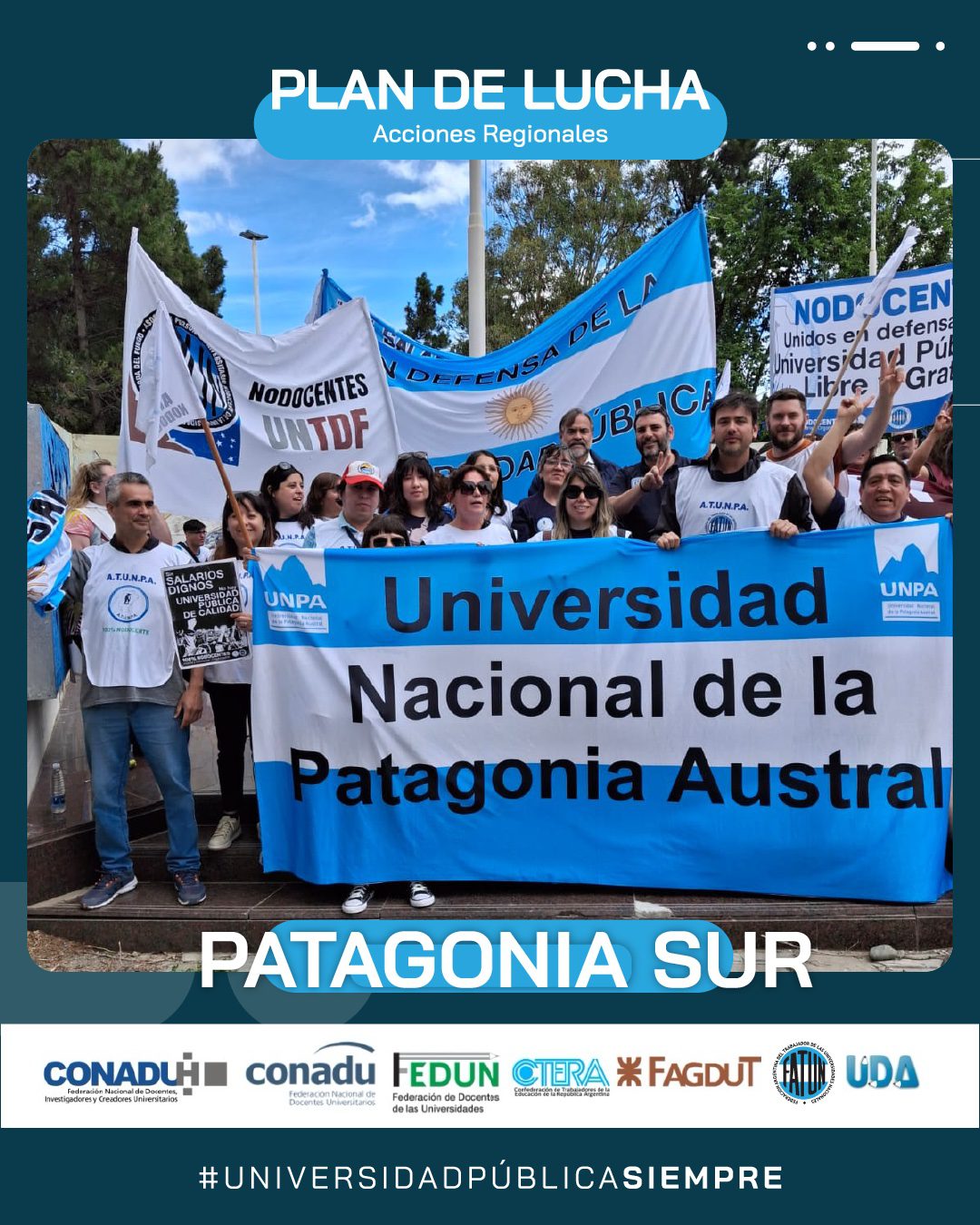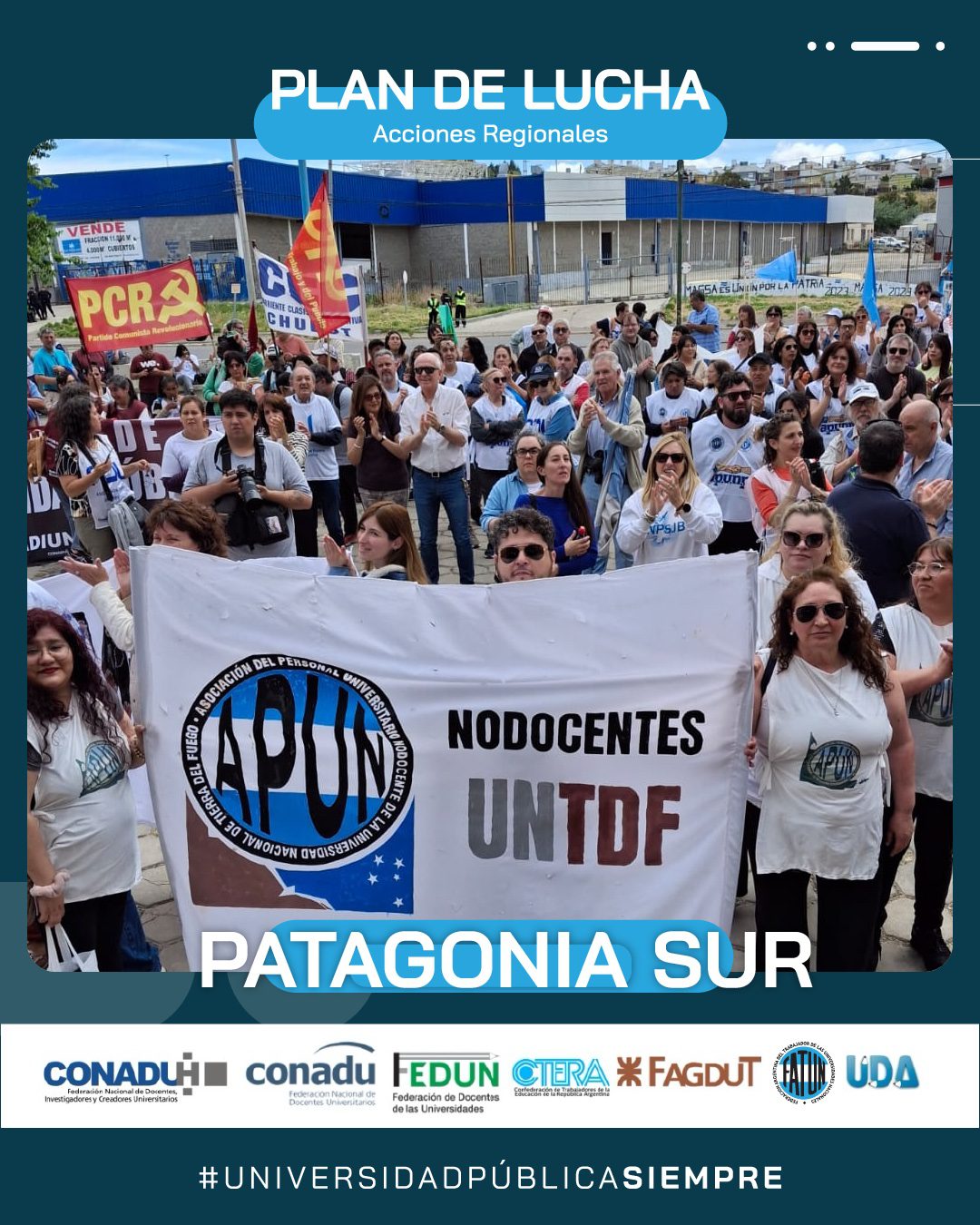En el día de hoy, continuando con el Plan de Lucha Federal por regiones que decidiera el Frente Sindical de Universidades Nacionales, se realizó la marcha en la Región Patagonia Sur (UNPA, UNPSBJ, UNTDF, UTN), en la ciudad de Comodoro Rivadavia, provincia de Chubut.