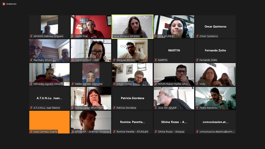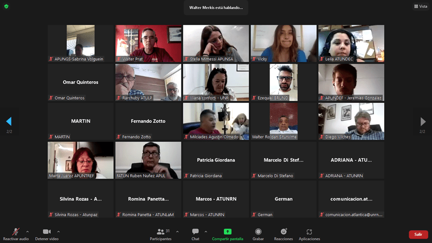 El pasado jueves se llevó a cabo la presentación de la Maestría en Gestión Universitaria, vía Zoom. En la misma estuvieron presentes el Secretario General de la FATUN, Cro. Walter Merkis, el Secretario de Capacitación, Cro. Daniel Villa, miembros de la Mesa Ejecutiva Nacional y Secretarios y Secretarias Generales de distintos Sindicatos de base adheridos.