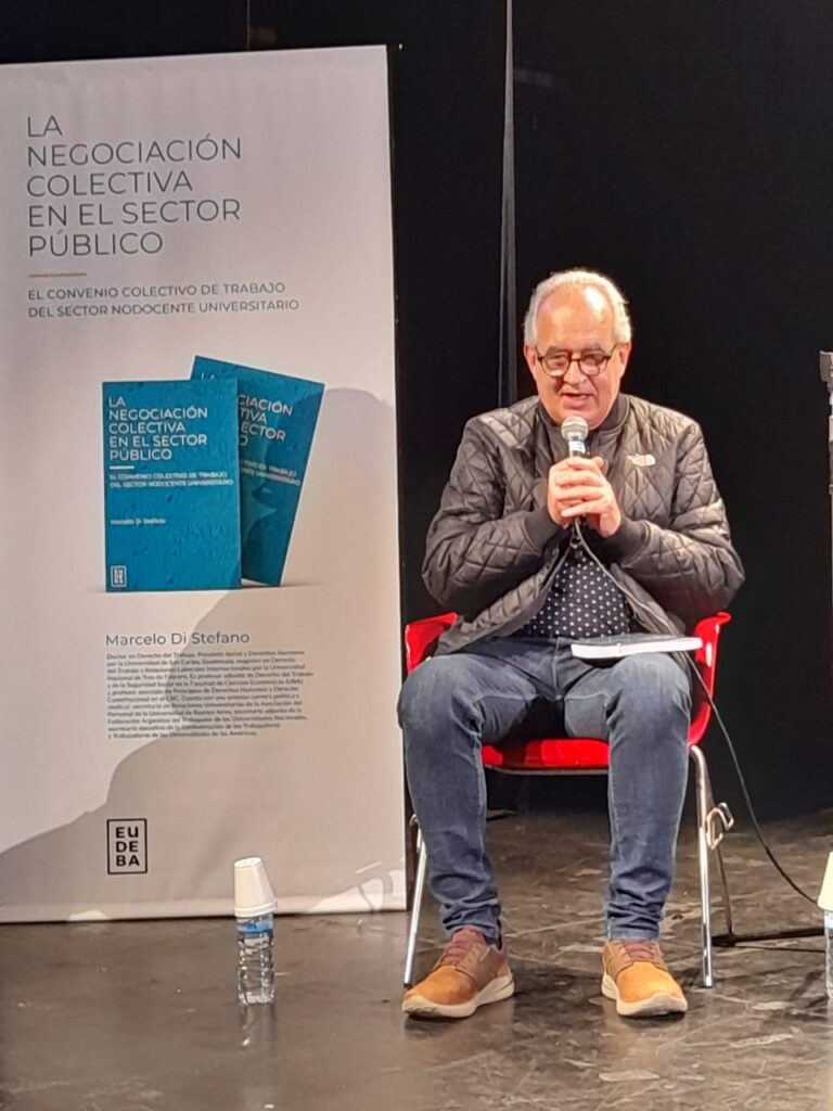 En la tarde de ayer, el Secretario General de la FATUN, Cro. Walter Merkis, junto al resto de los integrantes de la Mesa Ejecutiva Nacional, estuvieron presentes en la presentación del libro «La Negociación Colectiva en el Sector Público. El Convenio Colectivo de Trabajo del Sector Nodocente Universitario», que tiene a nuestro Secretario Adjunto, Cro. Marcelo Di Stefano, como autor. Dicho acto, se llevó a cabo en la Sala Muiño del Centro Cultural San Martín.