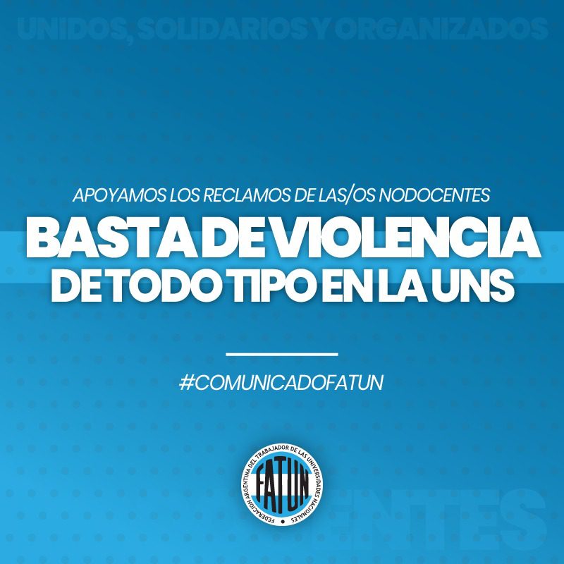 La Federación Argentina del Trabajador de las Universidades Nacionales acompaña el reclamo de las/os compañeras/os NODOCENTES de nuestro Sindicato de base de la Asociación de Trabajadores de la Universidad Nacional de Sur, ante la violencia laboral y el avasallamiento de derechos adquiridos. Desde la FATUN nos solidarizamos y respaldamos la medida de fuerza resuelta por […]